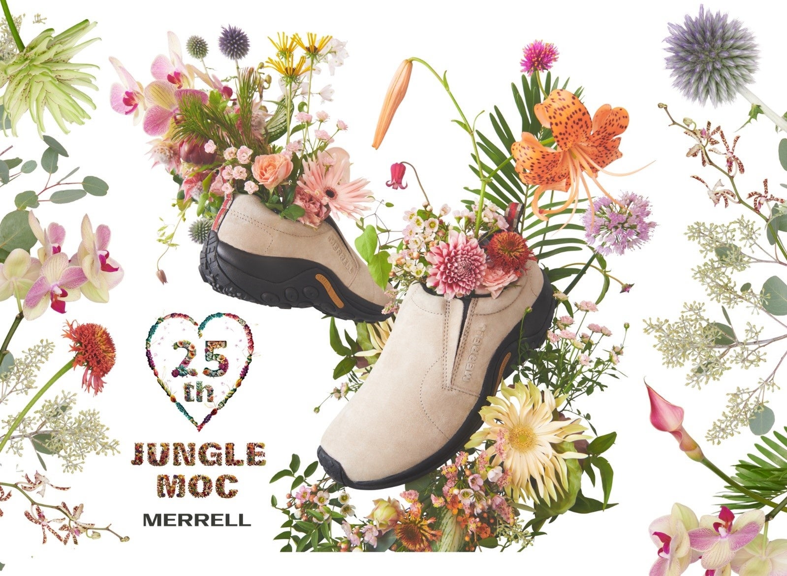 また、“JUNGLE MOC 25th Anniversary”キャンペーンを盛大なセレブレーションで盛り上げてくれるキービジュアルは、「花を棄てずに未来に繋げる」を理念に掲げ、独自の感性で花の可能性を引き出し、花のロスを最大限に無くすデザイン・クリエイションをする「edenworks」様により、「JUNGLE MOC」に生花のスペシャルアレンジメントを施して頂きました。日本各地のMERRELL販売店にて掲出いたしますので、美しい作品を是非ご覧ください!