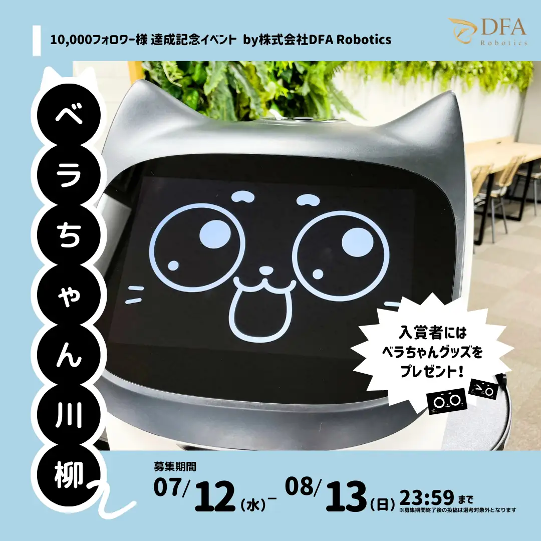 DFA Roboticsは、ネコ型配膳ロボット「Bella Bot(ベラボット)」に関するエピソードや出来事を5・7・5の川柳形式で募集する「第1回ベラちゃん川柳」の公募を7月13日から8月13日まで開催。