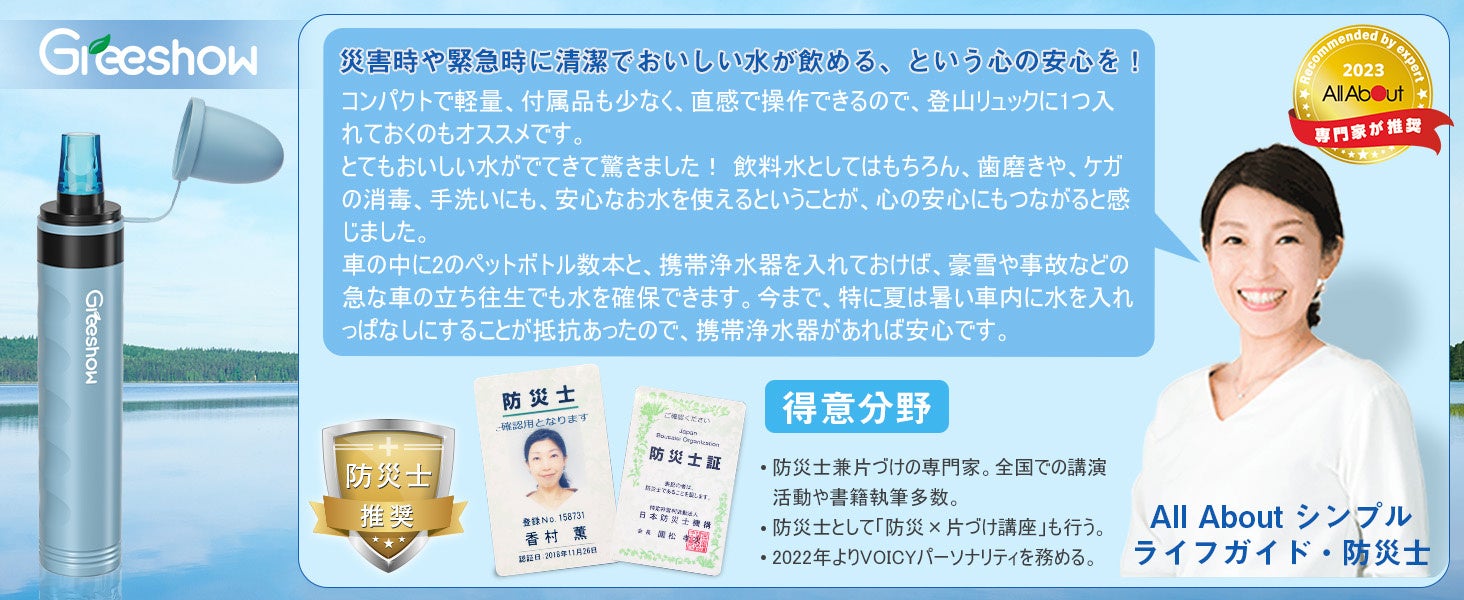 Greeshowの携帯浄水器は、災害や断水などの緊急時、地震、津波、台風、豪雨などの自然災害が発生した時、川やため池の水、お風呂の残り水などを安心して飲めるほど透き通った清潔な飲料水にろ過することができます。大切な家族の為の災害時の備え! 緊急用に一つ常備しておくことをおすすめします。