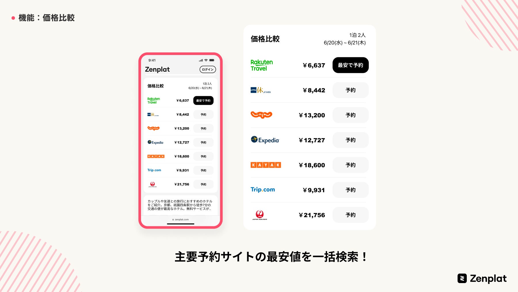 従来のポイントサイトではホテルの探索や比較は提携先の旅行サービスで行うことが必要でしたが、Zenplatではポイントを貯めそのまま探索や価格比較を行うことができます。