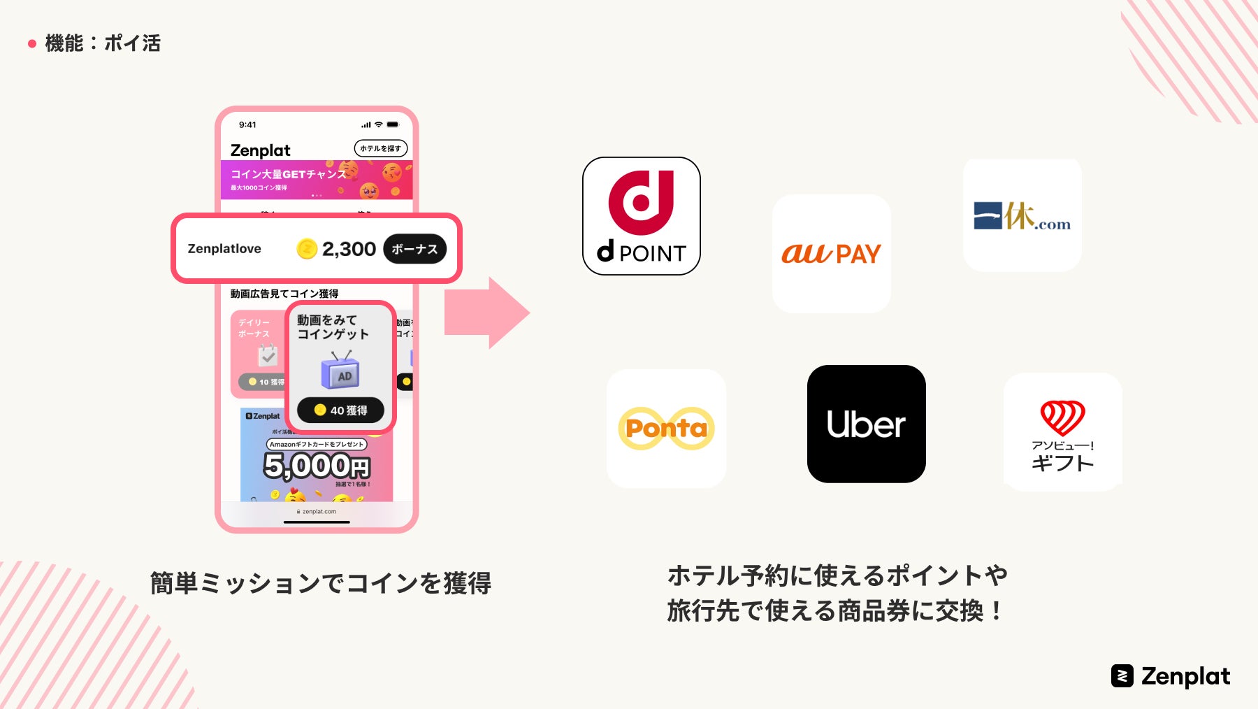 Zenplatは、動画広告や体験型広告(オファーウォール広告*2)などの簡単なミッションをこなすことでコイン(Zenplatサービス内ポイント)が貯まり、そのコインをホテル予約や旅行先で利用することができるサービスです。