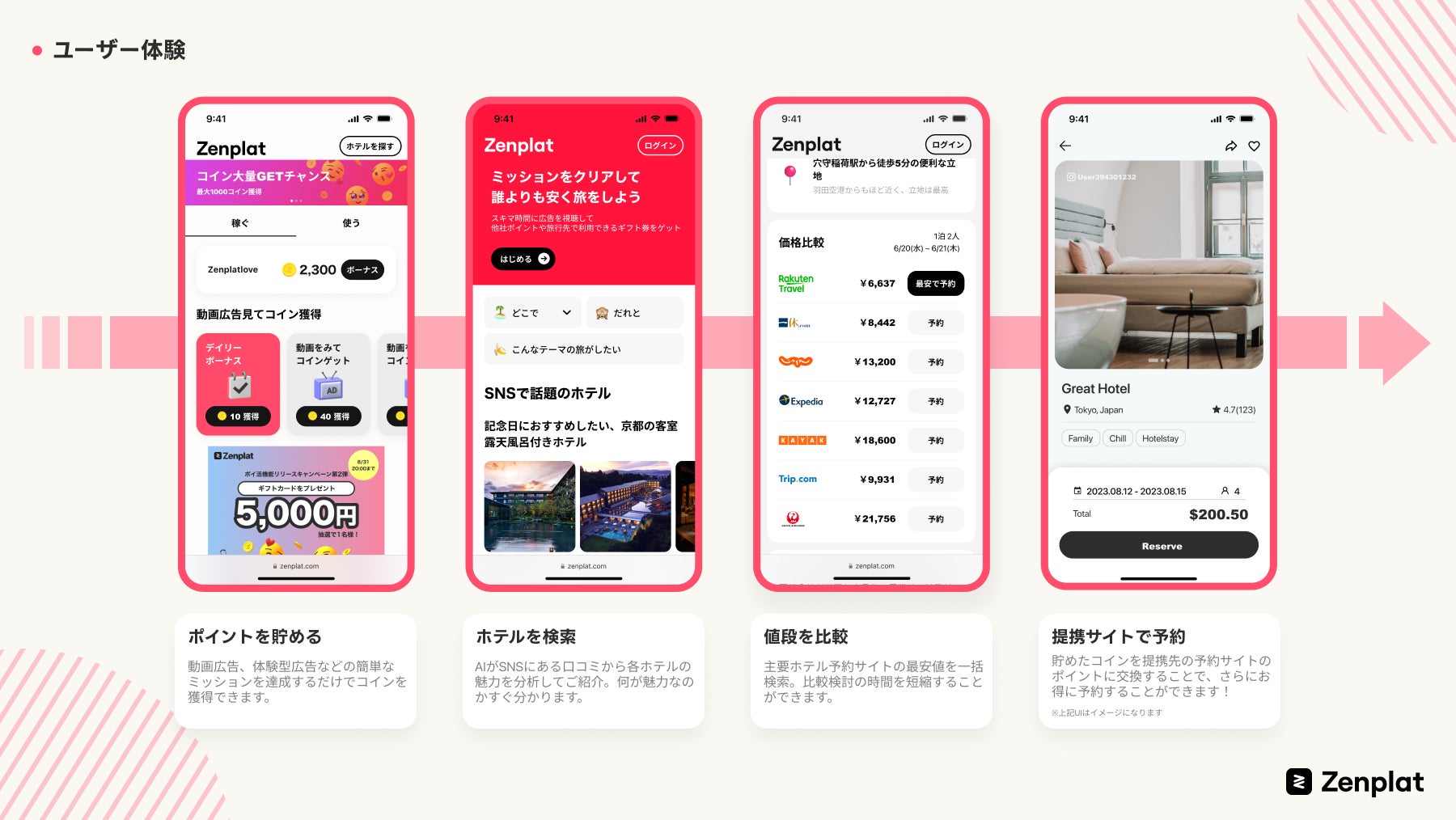 ユーザーはZenplat経由でコインを貯めホテルを予約することで、Zenplat内のコインと提携先旅行予約サービスのポイントの二重取りをすることができます。