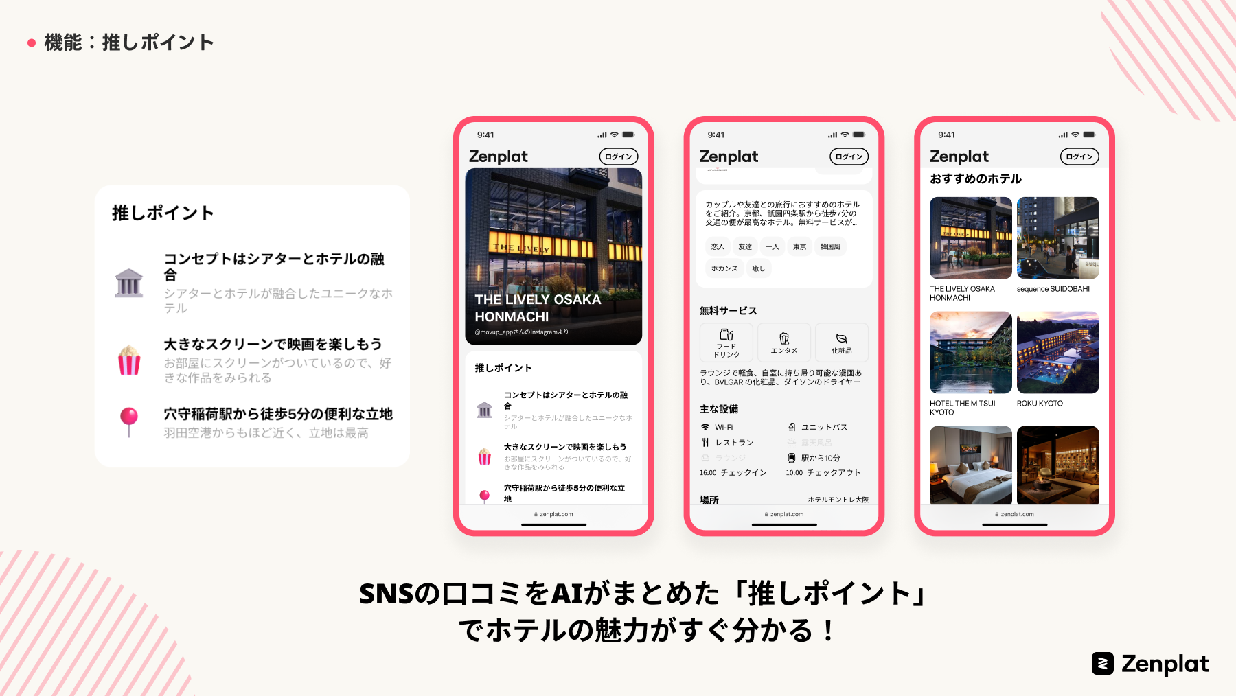 実際に宿泊した人のSNS投稿をAIが分析して、そのホテルならではの『推しポイント』をご紹介。