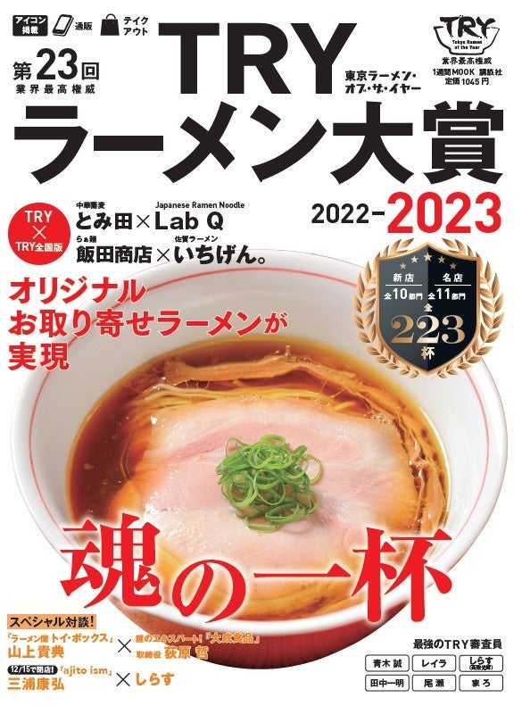「TRYラーメン大賞」は、講談社が発行する日本のラーメン情報雑誌で発表されるアワード。またTRYとは「Tokyo Ramen of the Year」の略称。「東京で一番旨いラーメンを決めようじゃないか」を合い言葉に、2000年に情報誌『TOKYO★1 週間』(現在は休刊)誌上にて味のジャンルごとにラーメン店のランキングを発表。その後、毎年秋に各賞のランキングを発表。2010年の『TOKYO★1 週間』の休刊を機にMOOKとして独立し企画を継続。2023年で24年目を迎える。審査対象は、東京をはじめ神奈川・千葉・埼玉の一都三県にある「ラーメン専門店」で、中華料理店などは除く。