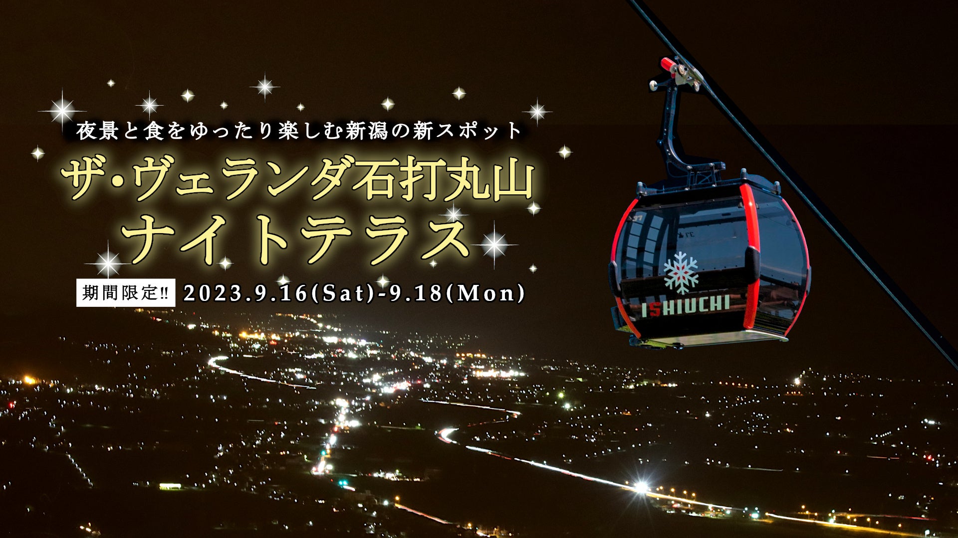9月のイベントでは、9/16日(土)~18日(祝・月)に営業時間を延長、眼下に広がる魚沼盆地の夕暮れ時から夜景を楽しむ「ナイトテラス」を開催、新店舗と夜のザ・ヴェランダ石打丸山をお楽しみいただけます。