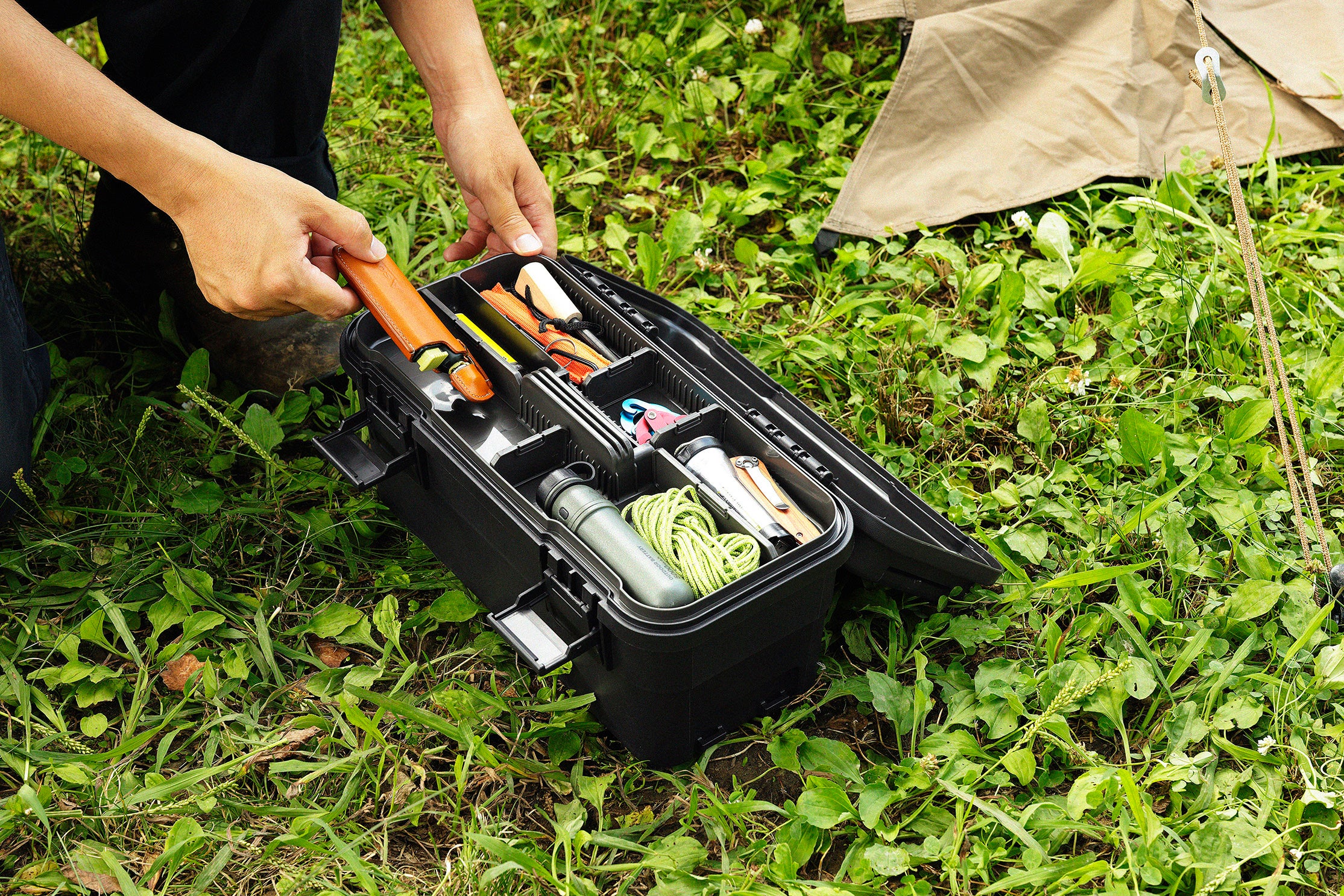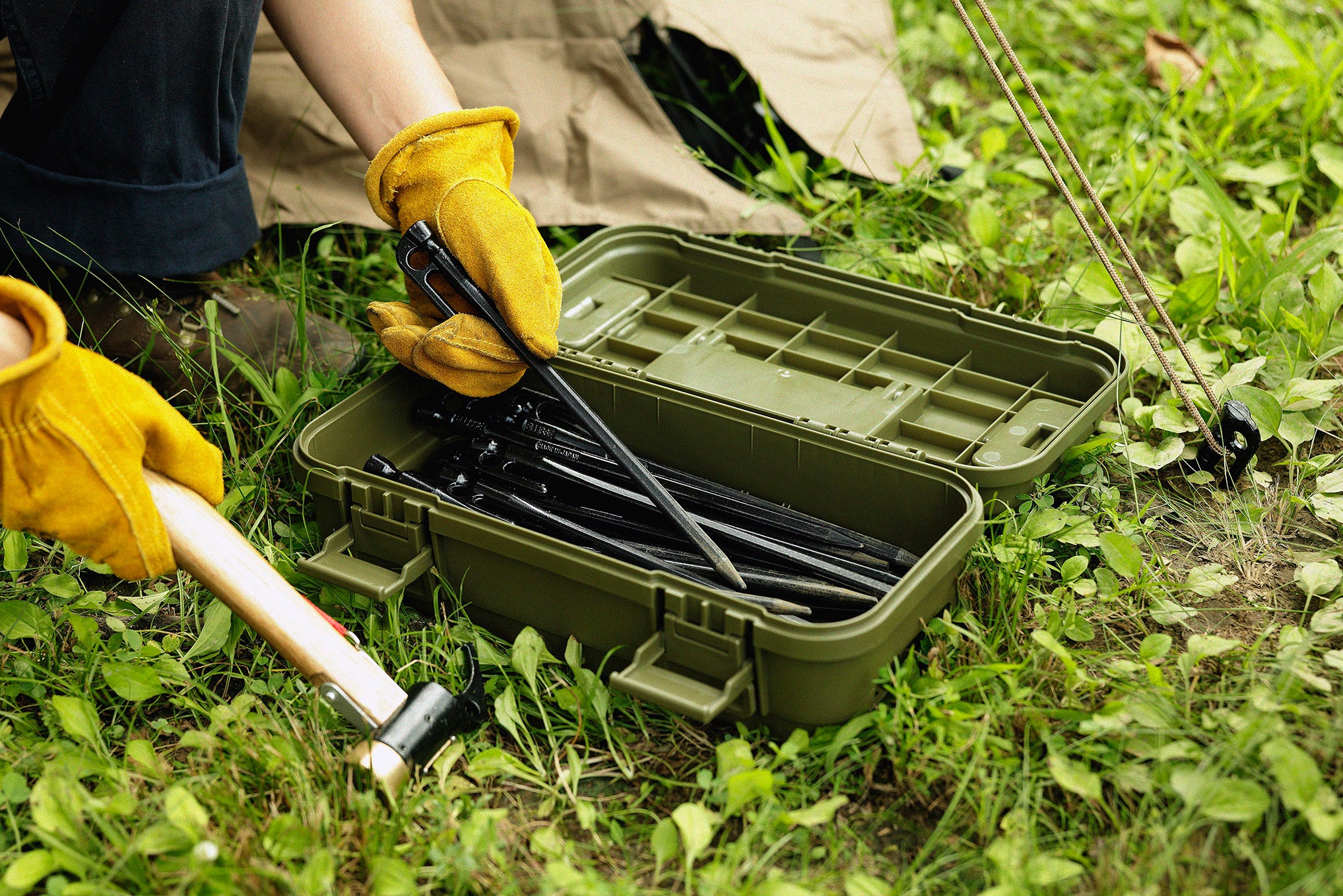 30cmまでのペグやハンマー、キッチン系の小物道具などを収納でき、専用の道具箱としての利用ができます。