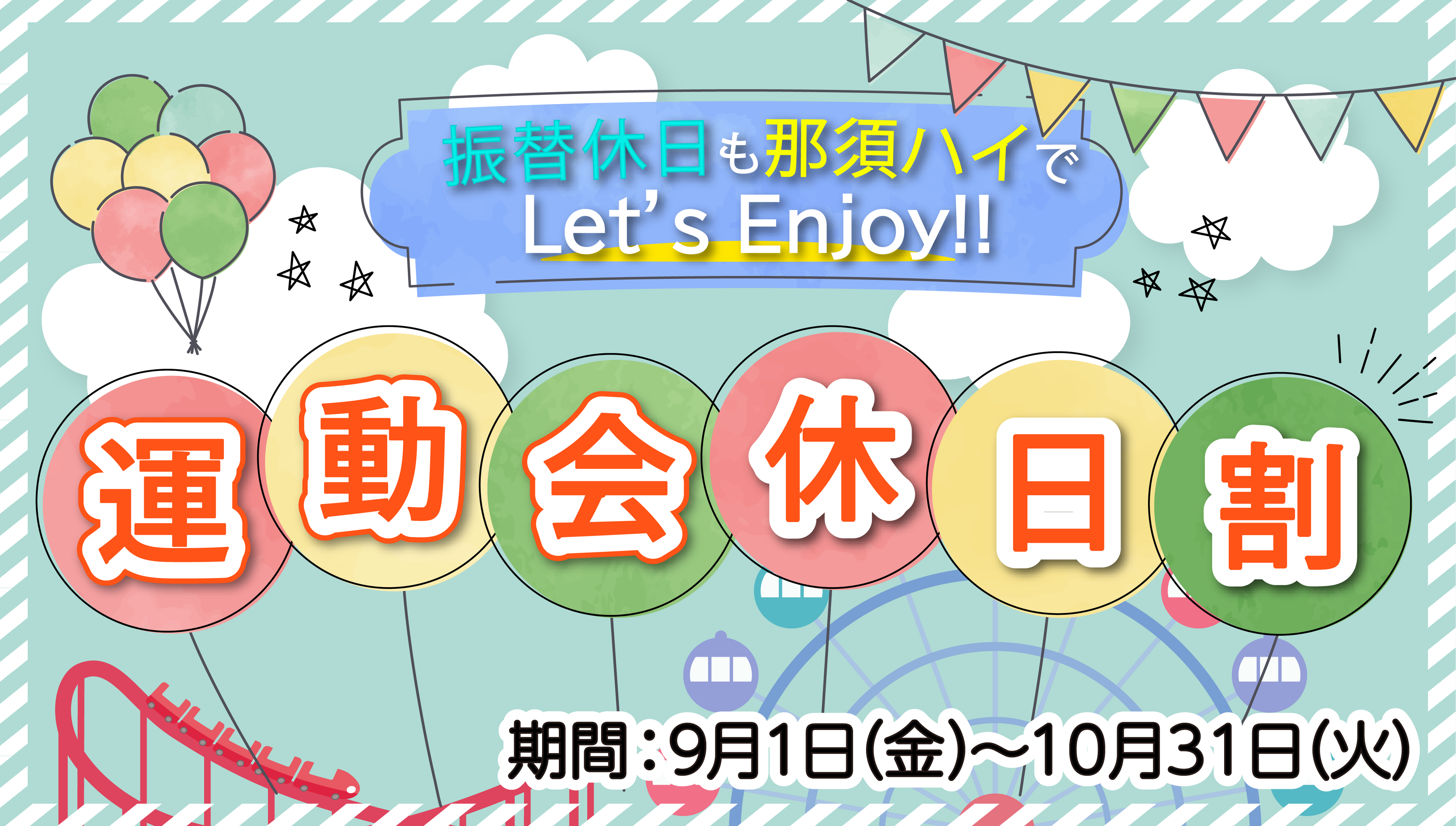 藤和那須リゾート株式会社(栃木県那須町/代表取締役社長:岩本 大二郎)が運営する“那須ハイランドパーク”では、9月1日(金)~10月31日(火)の期間中、運動会の振替休日でも最高の思い出をつくっていただきたいという思いから、入園+アトラクション乗り放題パスをお得にお買い求めいただける「運動会休日割」を実施いたします。