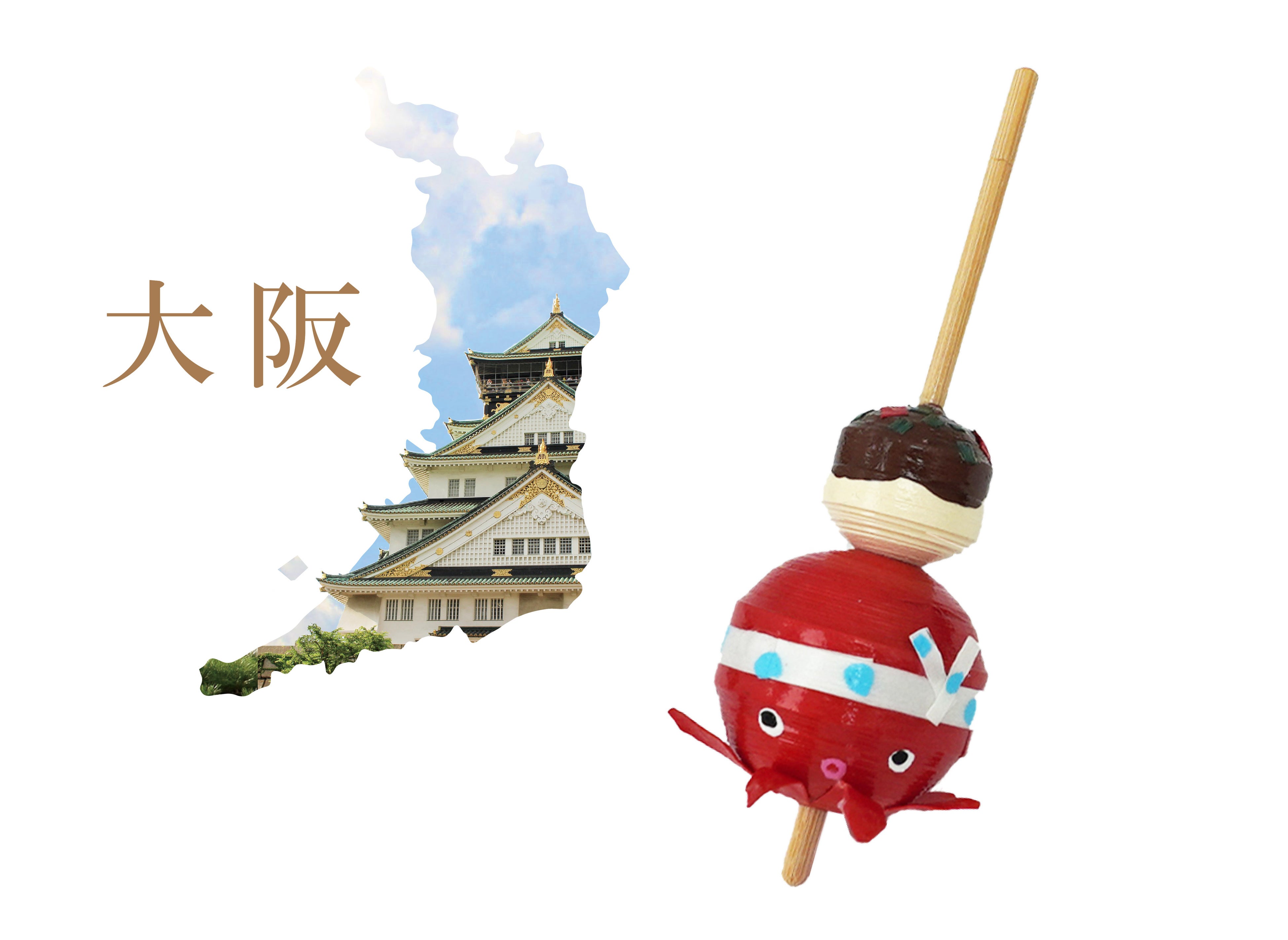 大阪のソウルフードといわれる粉もん料理のなかでも、お好み焼きと並んで人気の高い「たこ焼き」。今回は頭にハチマキを巻いた愛嬌あるタコチャンの上に、まんまるなたこ焼きが乗った、インパクト抜群の京こまを制作いただけます。