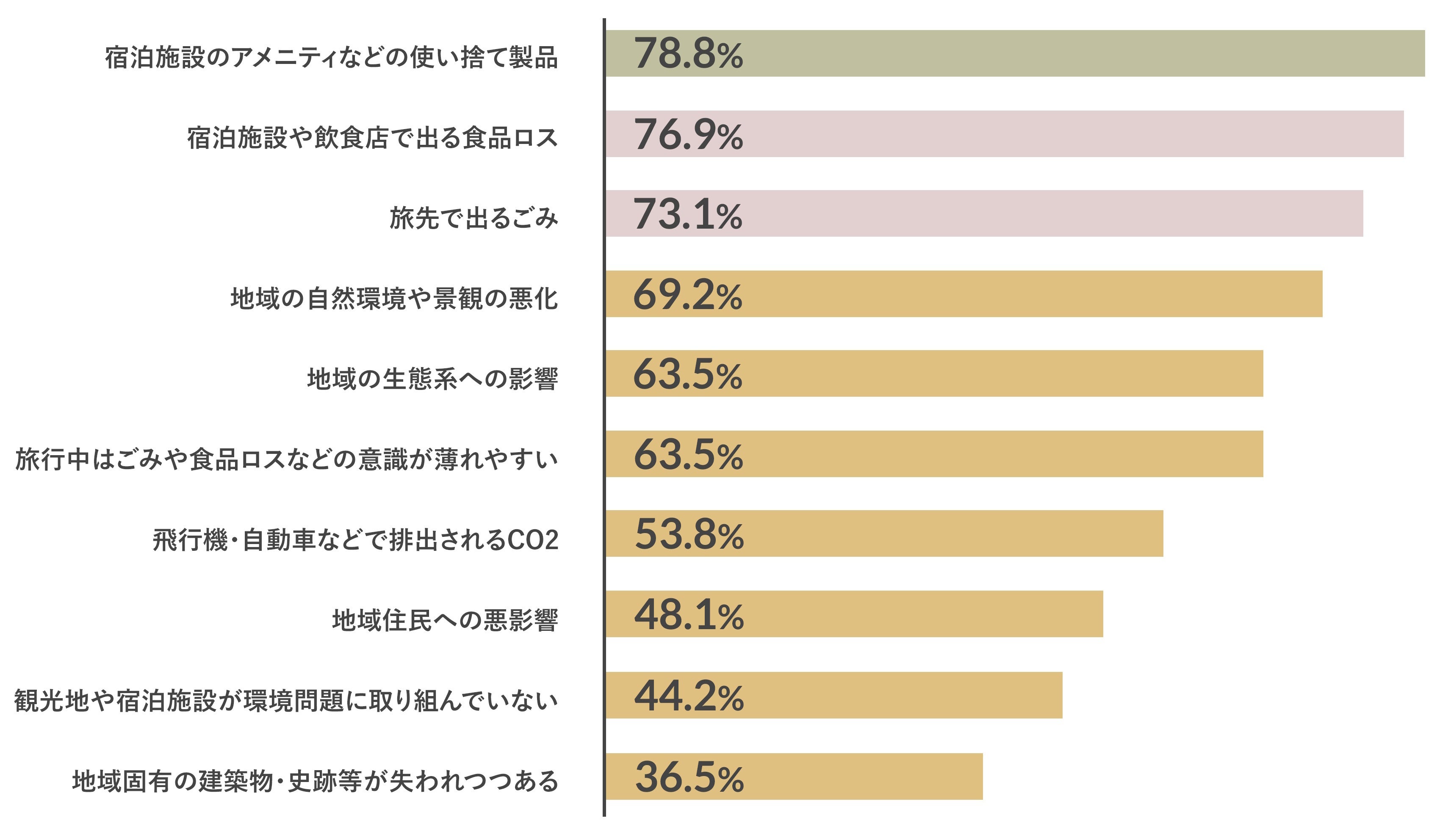 もっとも多かったのは、「宿泊施設のアメニティなどの使い捨て製品」、「宿泊施設や飲食店で出る食品ロス」、「旅先で出るごみ」でした。また「旅行中はごみや食品ロスなどの意識が薄れやすい」のように、旅行中の人々の心理的な変化を懸念する声も少なくありませんでした。