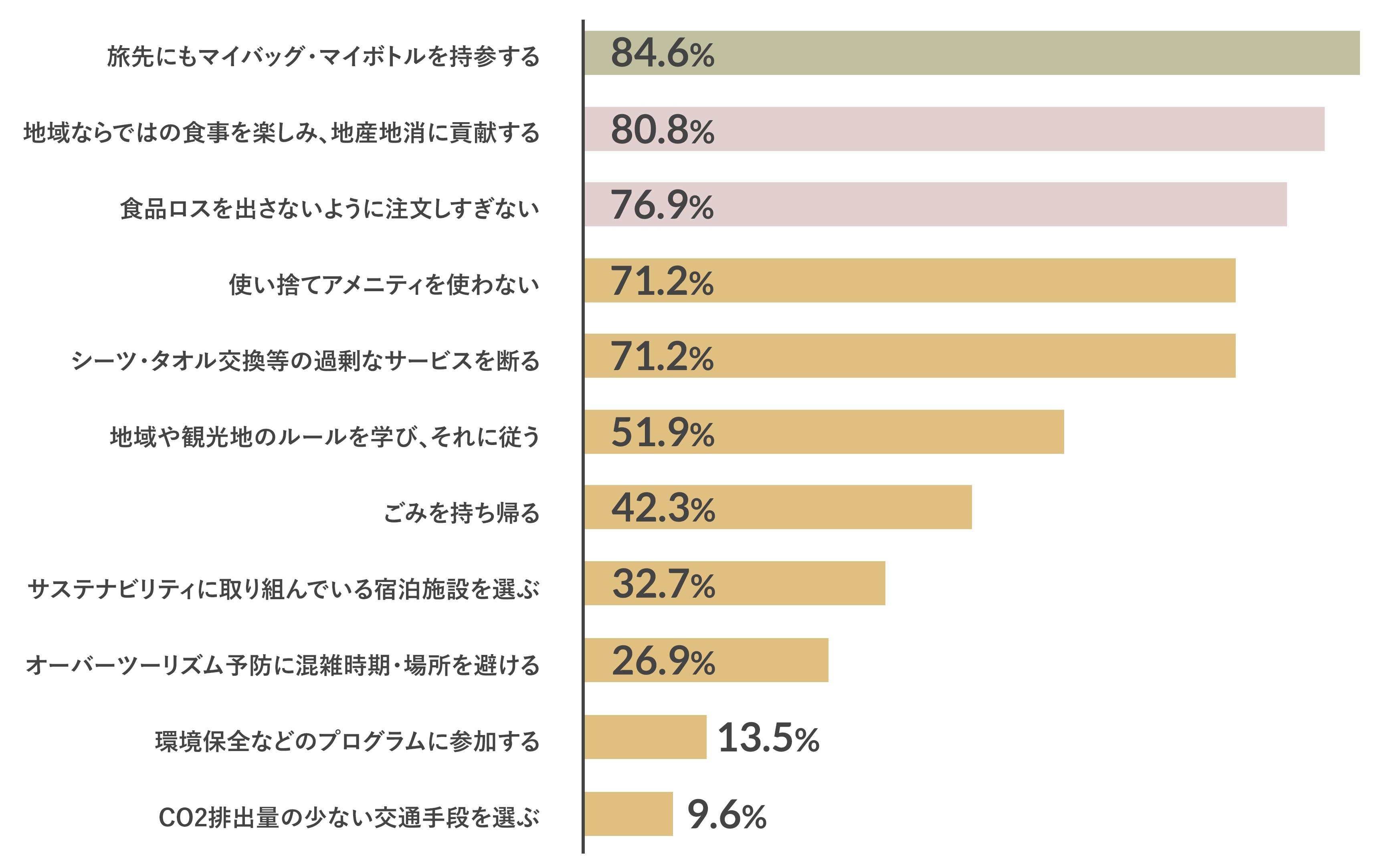 もっとも回答が多かったのは「旅先にもマイバッグ・マイボトルを持参する」で84.6%と9割近くの人が答えた。また「地産地消に貢献する」、「食品ロスを出さないように注文しすぎない」、「使い捨てアメニティを使わない」、「宿泊施設での過剰なサービスを断る」など、比較的すぐに取り組みやすい答えが多く支持された。
