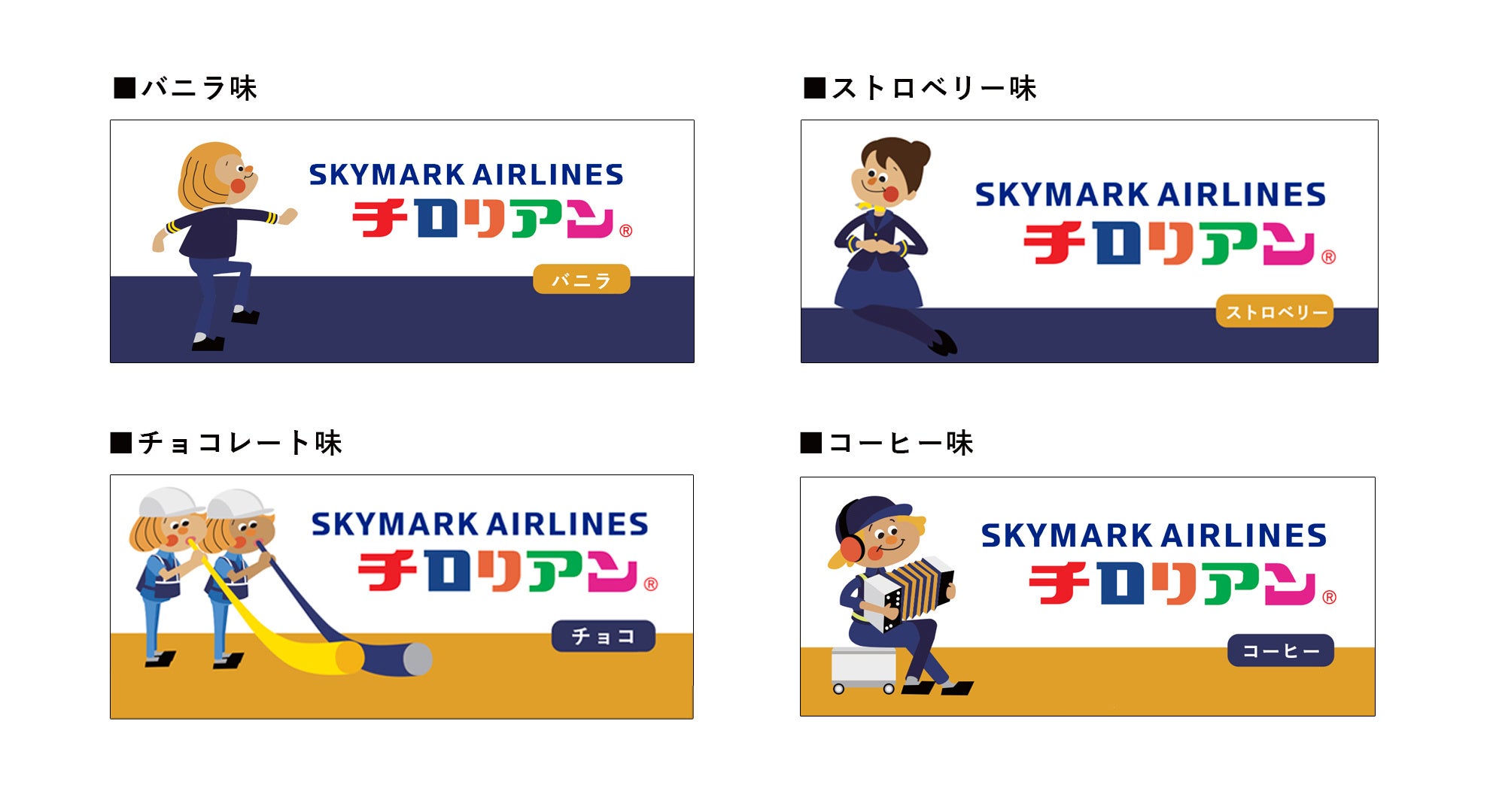 フレーバーは、定番のバニラ味をはじめ、ストロベリー、チョコレート、コーヒーの4種類をご用意。チロリアンの仲間たちもスカイマークの制服に着替えて演奏を楽しんでいます★