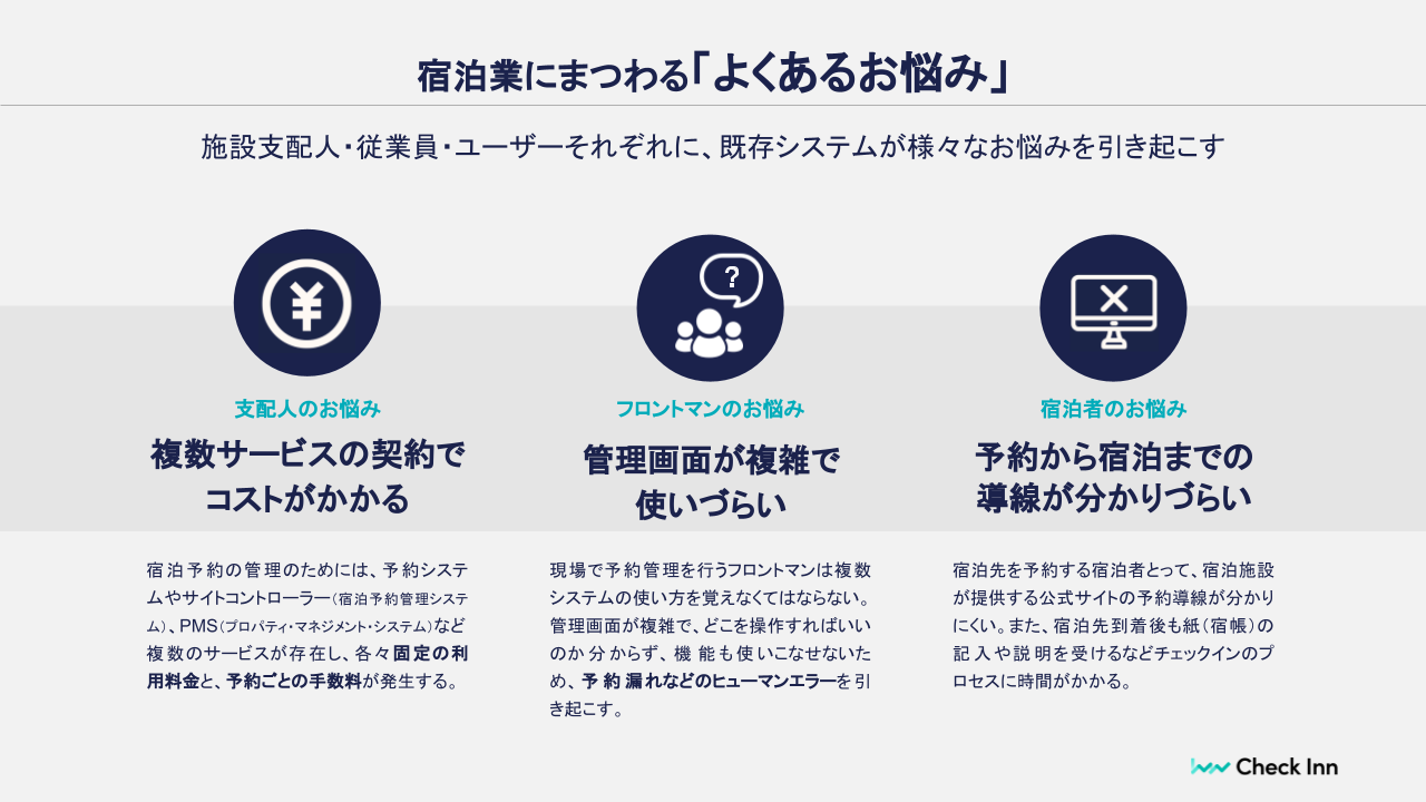 宿泊施設を運営するにあたり、複雑なシステム構成によるDX化の遅延・業務の属人化などの根深い課題に着目し、2022年6月にオールインワンツール「Check Inn」をリリースいたしました。