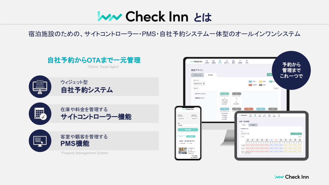 「Check Inn」はサイトコントローラー・自社予約エンジン・PMS一体型の宿泊施設向けオールインワンシステムです。