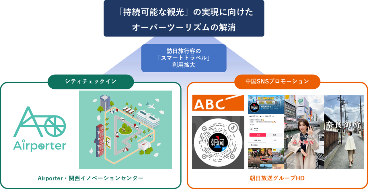 朝日放送グループHDが培ってきた中国SNSプロモーションノウハウをもとに、中国訪日旅行客に向けてAirporterと関西イノベーションセンターが取り組む「シティチェックイン[1]」を中心にスマートトラベルを喚起することで、今後懸念されるオーバーツーリズムの解消を目指します。実証実験では、中国旅行系トップKOL[2]との連携によるSNS動画制作、配信や中国KOL、KOC[2]による日本モニターツアーを実施予定です。