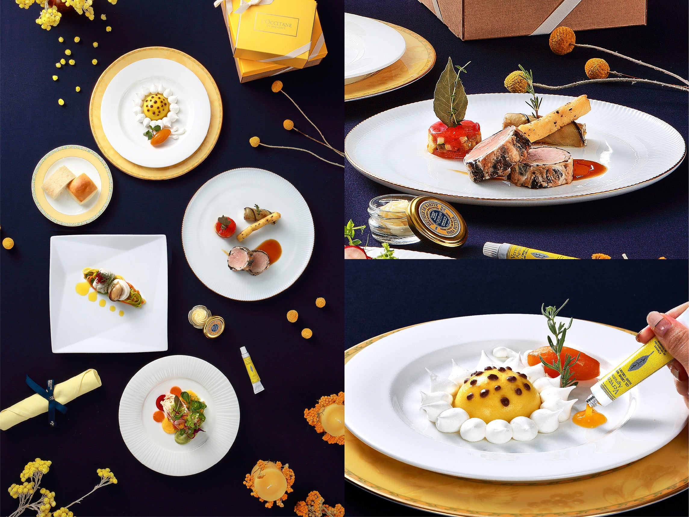 南仏プロヴァンスの自然豊かな情景とふりそそぐ陽光をイメージした期間限定のフレンチコース料理。メインには茨城県が代表する銘柄鶏“つくば鶏”(ランチ)・銘柄豚“常陸の輝き”(ディナー)を使い、茨城県ならではの魅力を味わうことができます。また、愛らしい向日葵を模るデザートは、ハンドクリームそっくりの特製パッションソースで仕上げるユニークな一皿。所々にちりばめられたイエローカラーのアクセントとコラボレーション限定の遊び心ある演出が見どころです。
