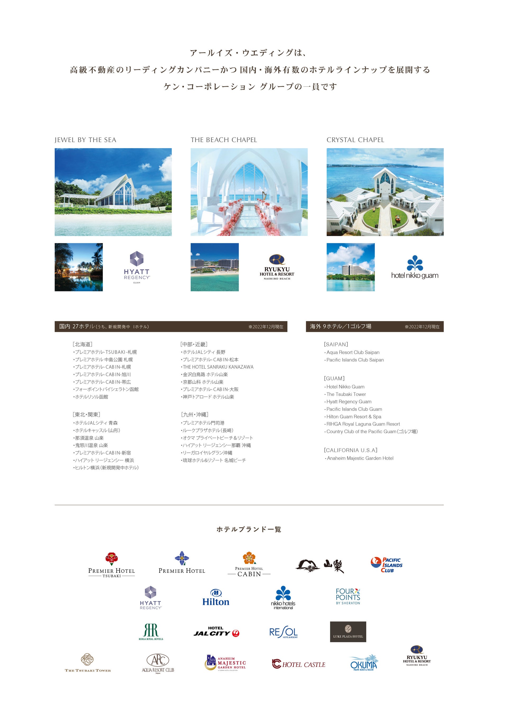 「風までも、思い出になるウエディング」をコンセプトに、ハワイ・グアムの海外挙式・沖縄の国内リゾート挙式を手掛けるウエディングブランド「アールイズ・ウエディング」、オリジナルドレスブランド「アールイズ・ドレス」、映像・写真に特化した「アールイズ・ピクチャーズ」、旅行をサポートするサービス「アールイズ・トラベル」の4ブランドを展開。