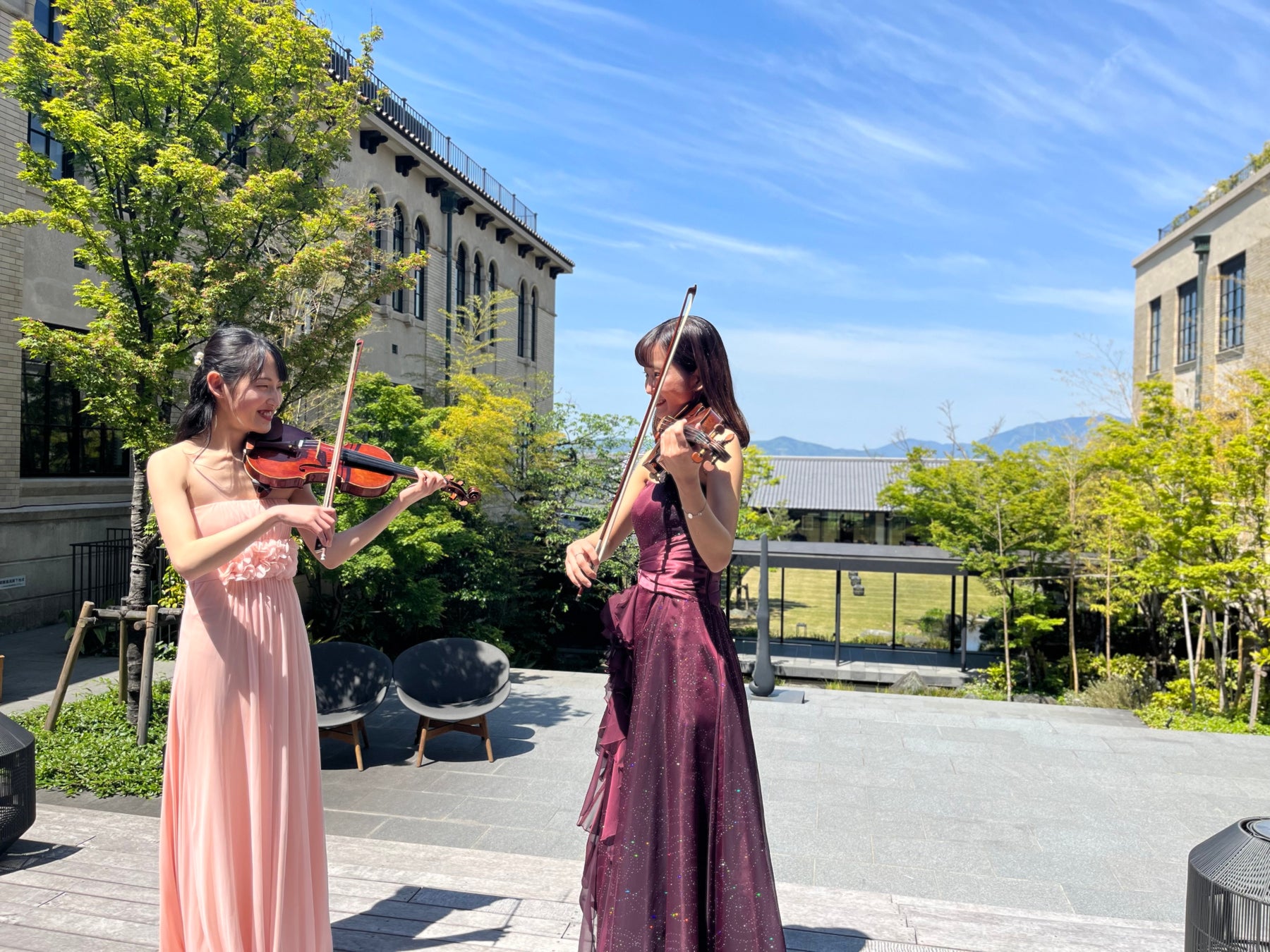 夕刻のゲストラウンジ、朝食レストラン、京都の西山を望むテラスでの朝、管弦楽の心地よい響きをお届けいたします。ステージの上でない目の前での演奏に、演奏者の表情やリズムの取り方など間近にご覧いただけます。音楽を耳だけではなく、視覚的にも楽しめる生演奏です。