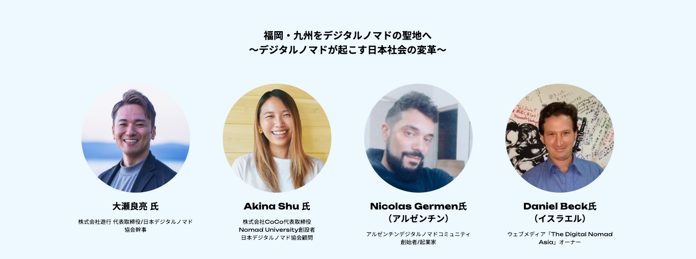 ・内容:国内外のワーケター、企業、デジタルノマドが集結し、未来のワーク&ライフスタイルについて議論を繰り広げる日本初のイベント。オープニングセッションでは、ワーケーションのトップランナーが集結し、未来志向で個人、企業、社会において進むワーケーションの将来像について議論。さらに、国も注目する“デジタルノマド”が登壇し、そのライフスタイルや福岡・九州のポテンシャル等、デジタルノマドにフォーカスしたスペシャルセッションを開催します。テーマに分かれてのグループセッションでは多様な視点とアイデアを交換、ワーケーションで実現する組織・人材開発の取組や、ワーケーション推進自治体参加による地域の関係人口拡大、世界各地から参加するデジタルノマドとのネットワーキング等、イベント参加者それぞれの未来への展望を広げるチャンスを創出します。