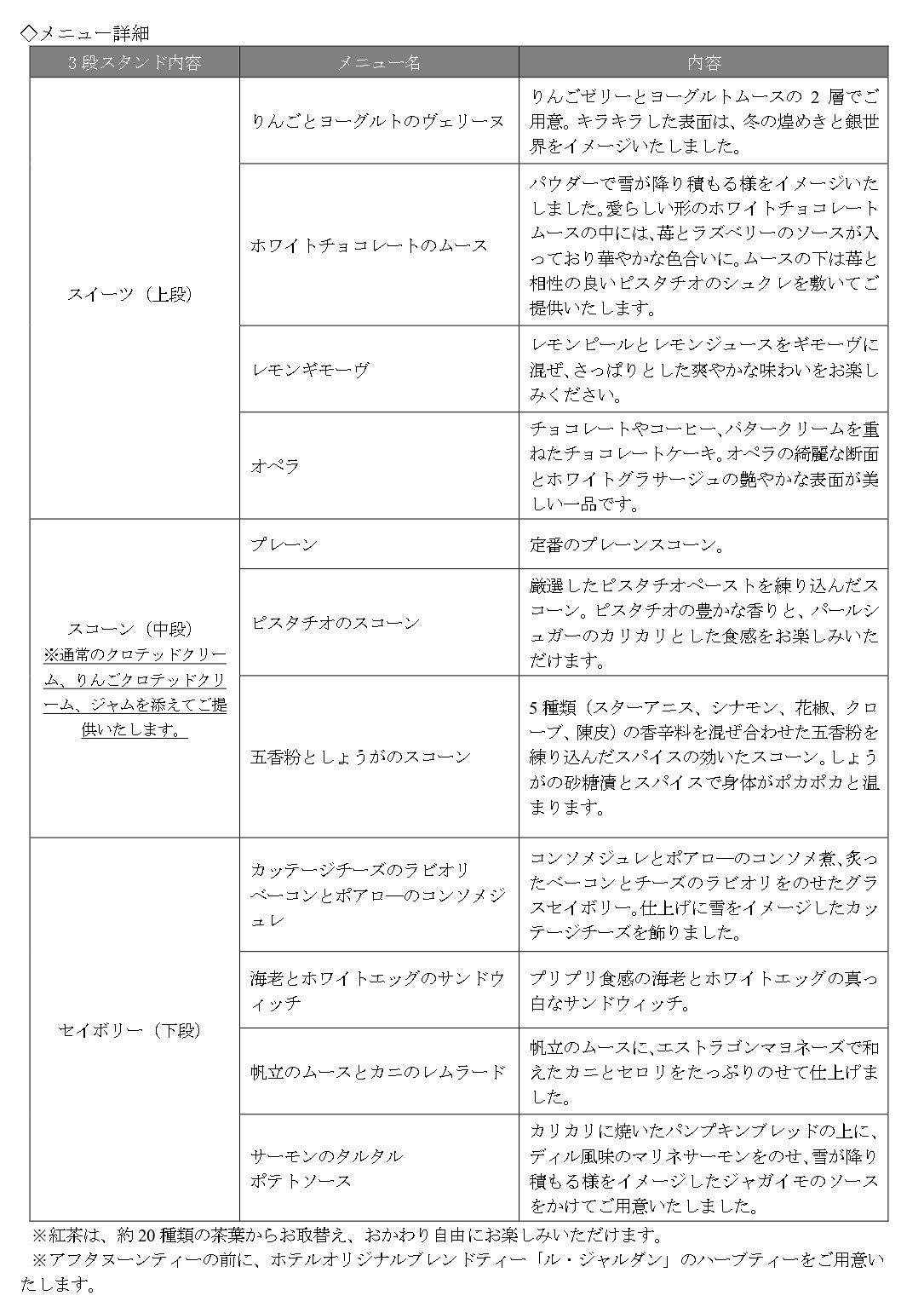 下段のセイボリーでは、ポアロ―のコンソメジュレの上に香ばしく炙ったベーコンとチーズのラビオリをのせ、さらに雪に見立てたカッテージチーズをのせたグラスセイボリーの他、海老とホワイトエッグのサンドウィッチ、帆立のムースとカニのレムラード、サーモンのタルタルの4種をお楽しみいただけます。