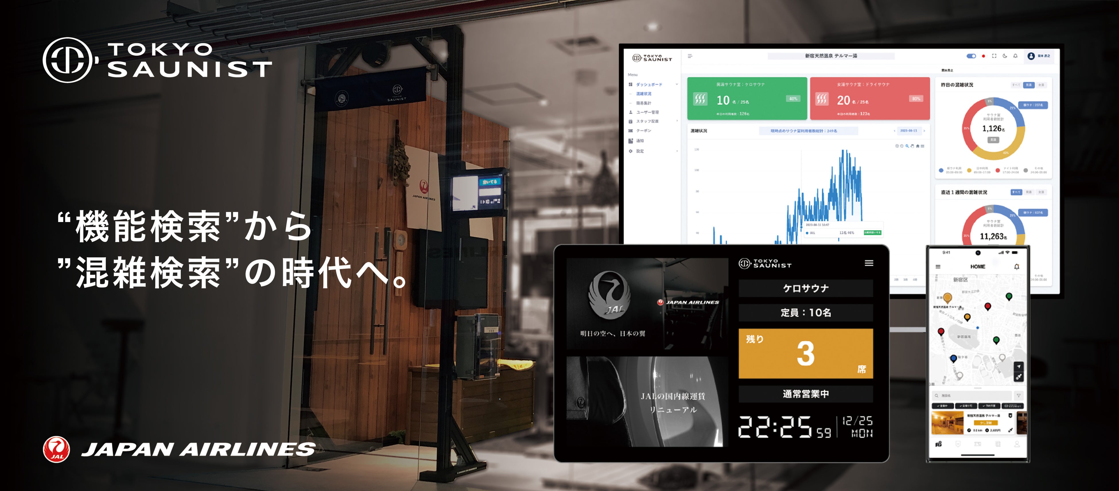 2019年より「サ旅」を推進してきたJALが展開する、第2のサウナブランド「TOKYO SAUNIST」。サウナ室前に設置した高精度センサーで人を検知し、リアルタイムでサウナ室内の混雑状況を可視化するDXソリューションサービスを展開します。
