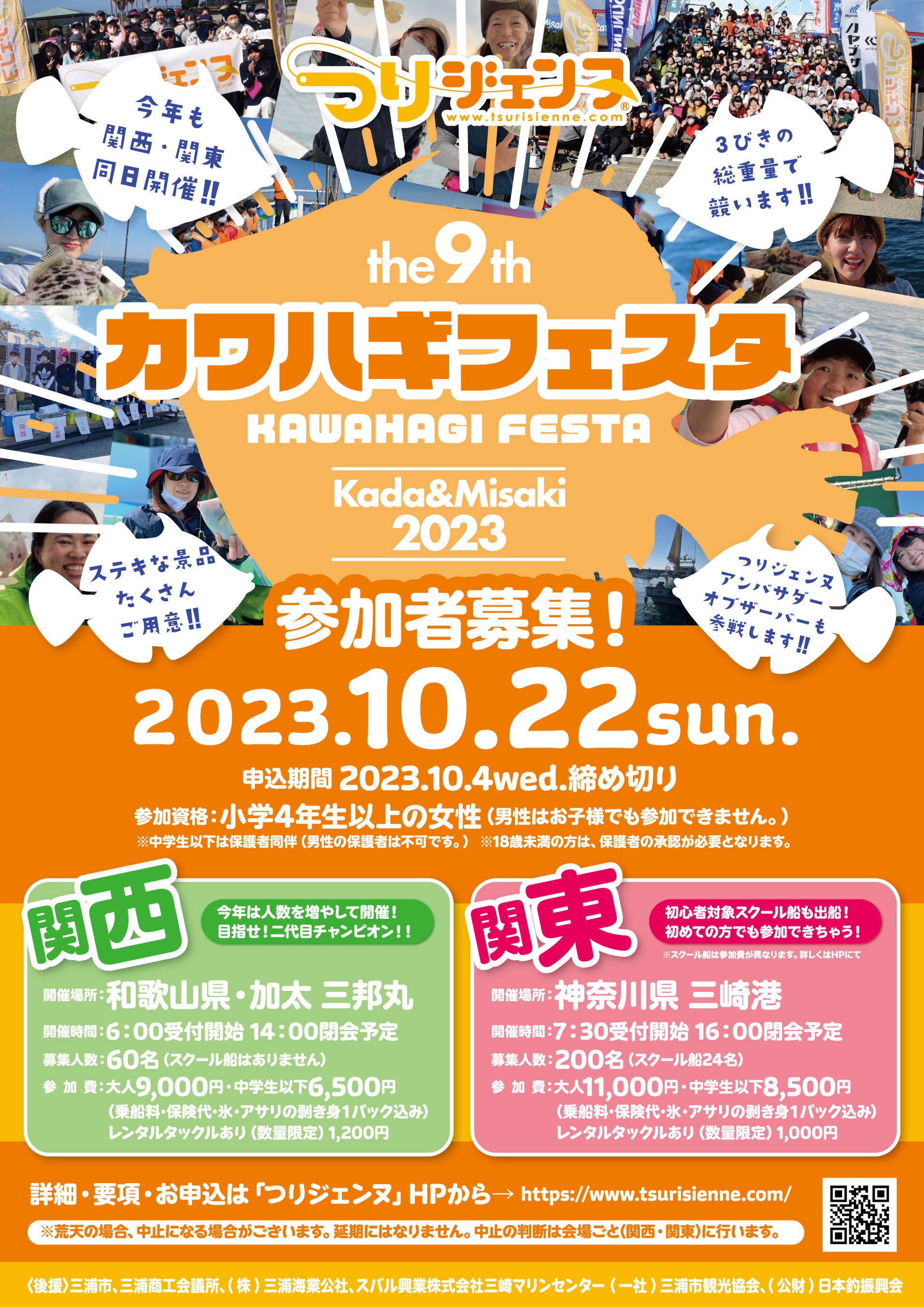 今年で第9回となる『女性だけのカワハギフェスタ 2023』 は世界最大規模の釣りイベント!! 2022年からは新たに関西会場でも同時開催しています。回を重ねるごとに盛り上がりを見せており、今年は2会場で計260名の参加を見込んでいます。大会では釣ったカワハギ3尾の重量を競い、上位入賞者には豪華な賞品が進呈されます。また、参加者には参加賞としてつりジェンヌが用意したノベルティが配られるほか、協賛企業からの素敵な景品が当たる大抽選会などもあります。