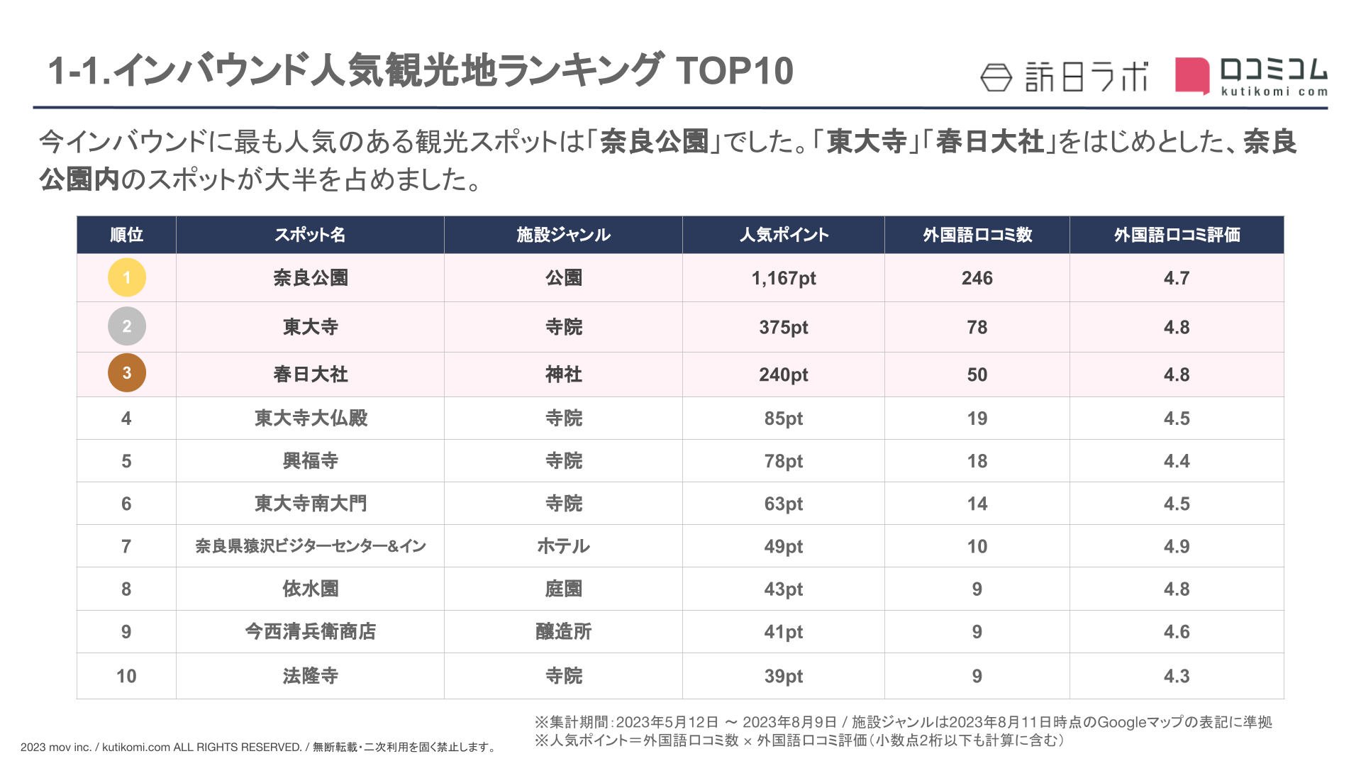 数ある観光地のなか、奈良県で今インバウンドに最も人気がある観光スポットは「奈良公園」でした。「東大寺」「春日大社」をはじめとした、奈良公園内のスポットが大半を占めました。