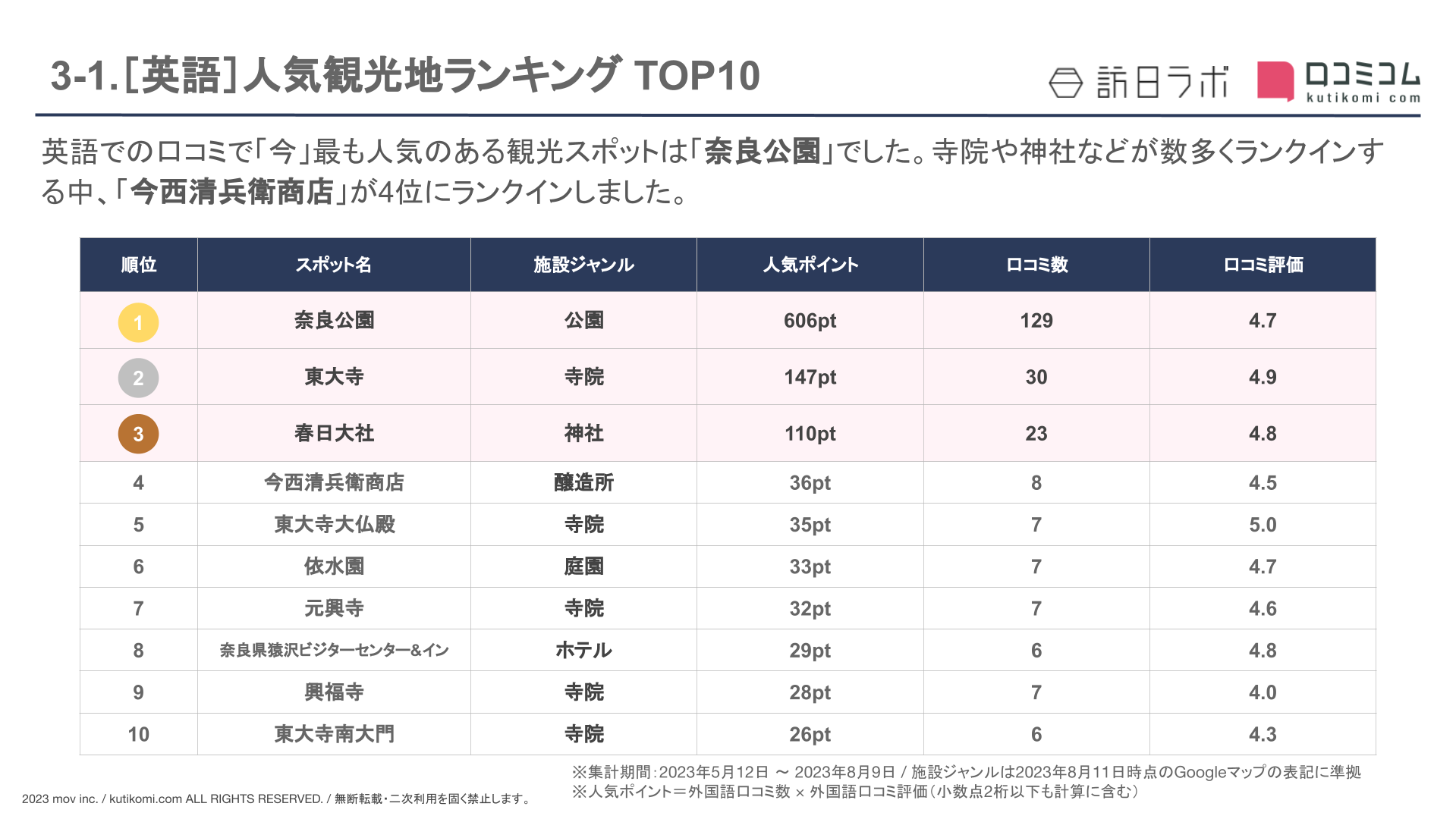 英語での口コミで「今」最も人気のある観光スポットは「奈良公園」でした。寺院や神社などが数多くランクインする中、日本酒・春鹿の醸造元「今西清兵衛商店」が4位にランクインしました。