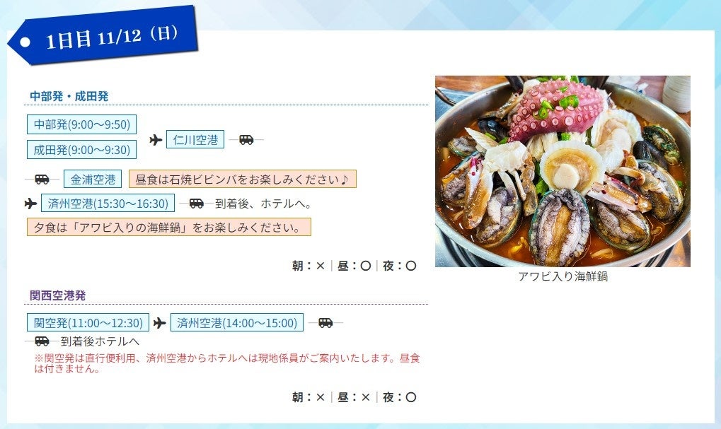 関空発は1日目夕食時から3日目チェジュ空港まで添乗員が同行いたします。