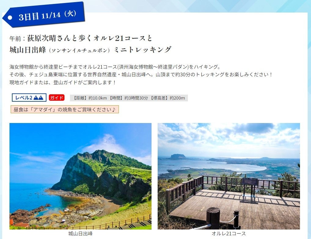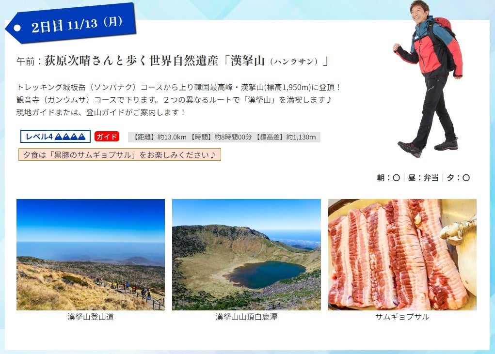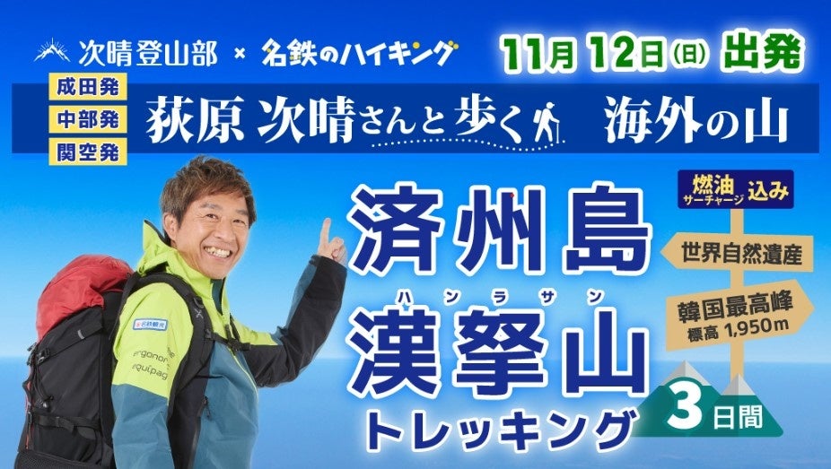 名鉄観光(本社:愛知県名古屋市、代表取締役社長:拝郷寿夫)は、「荻原次晴さんと歩く!次晴登山部 韓国済州島/漢拏山(ハンラサン)トレッキング 3日間」を発売開始しました。