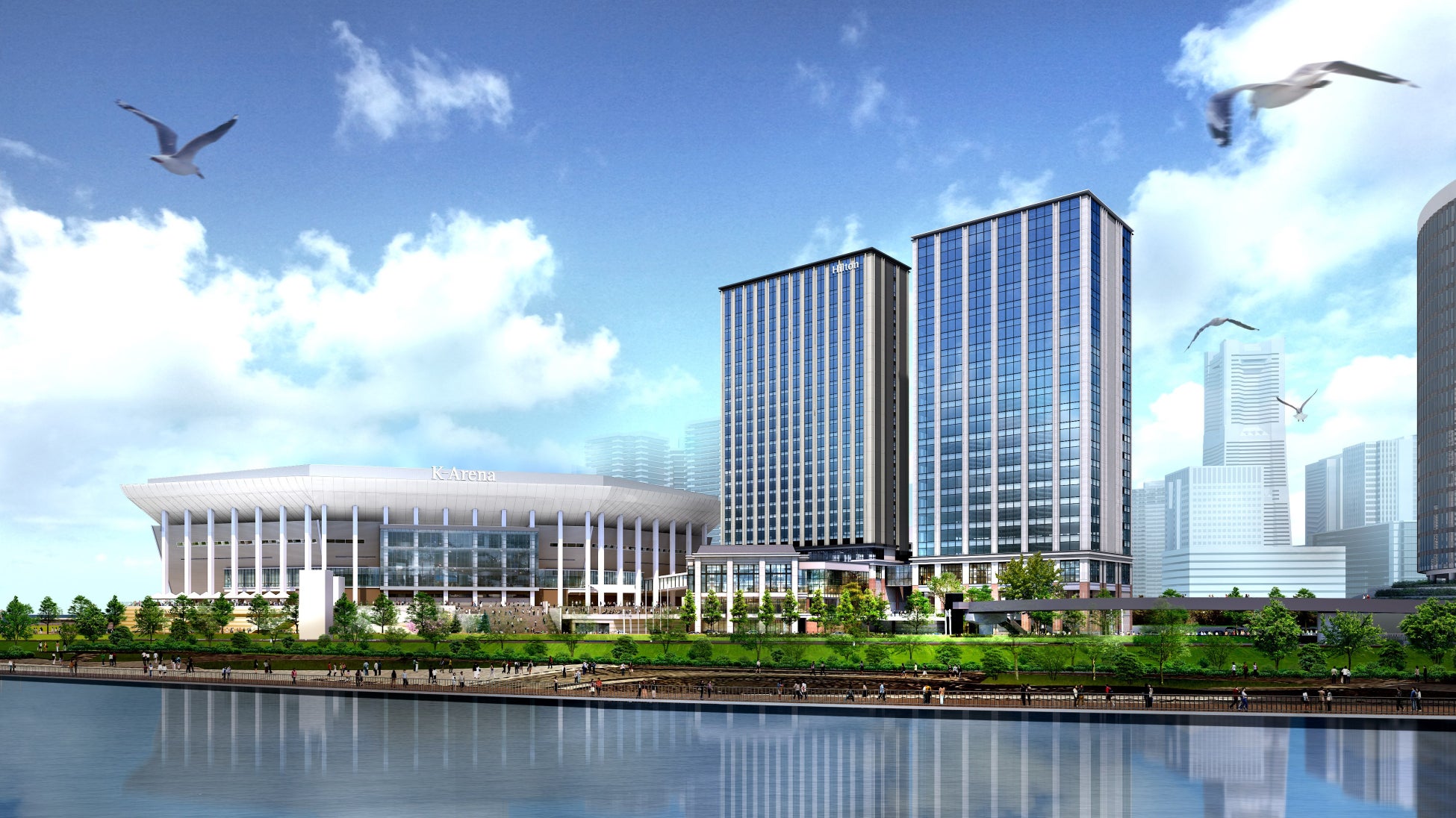 外観イメージ(左から「Kアリーナ横浜」、「ヒルトン横浜」、オフィス棟「Kタワー横浜」)