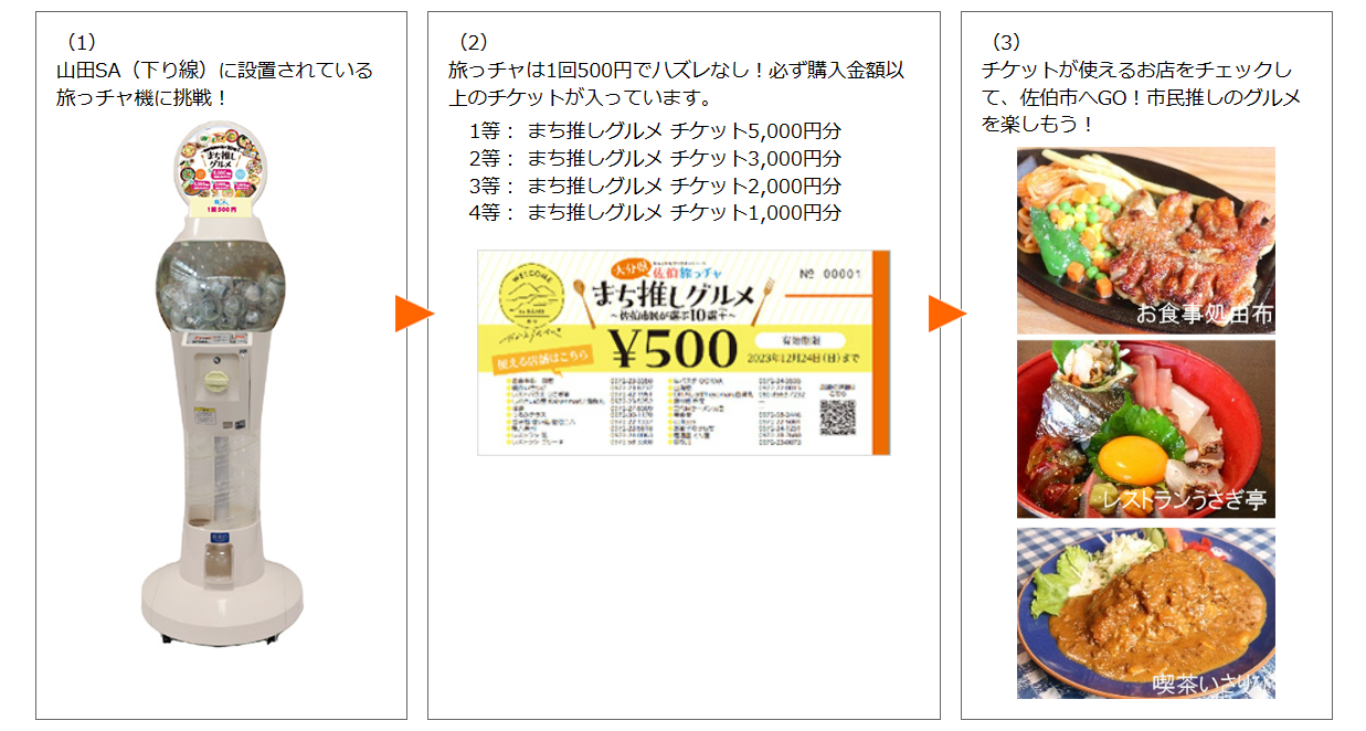 旅っチャとは、旅先で使えるお得なチケットが入った「運試し型のチケット販売機(以下、旅っチャ機)」を使った、クルマ旅キャンペーンです。サービスエリア(SA)に設置された、旅っチャ機でカプセルを購入すると、必ず購入金額を上回る、地域で使えるチケットが入っています。どれだけお得なチケットが当たるかは、運しだい!