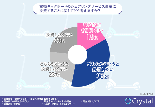 そこで今回、電動キックボードシェアリングサービス「Su__i(スーイ)(https://su-i-ride.com/)」を提供するCrystal株式会社は全国の投資家1,007名を対象に、「電動キックボード事業への投資」に関する調査を実施しました。