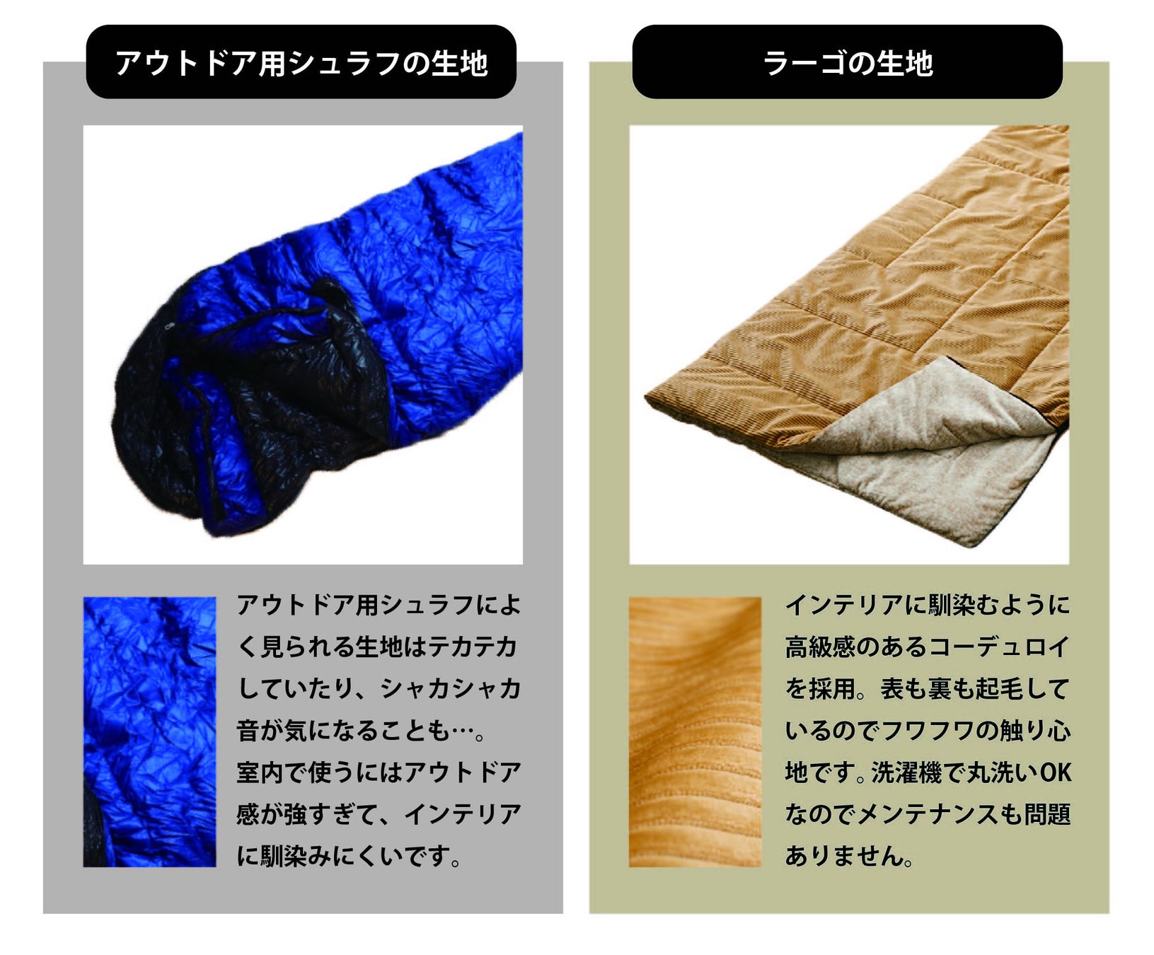 そんな中で使用場所や時期が限られるシュラフやこたつ布団を、インテリア性を損なわずに普段使いできたら…、という想いから今回「ラーゴ」を開発するに至りました。