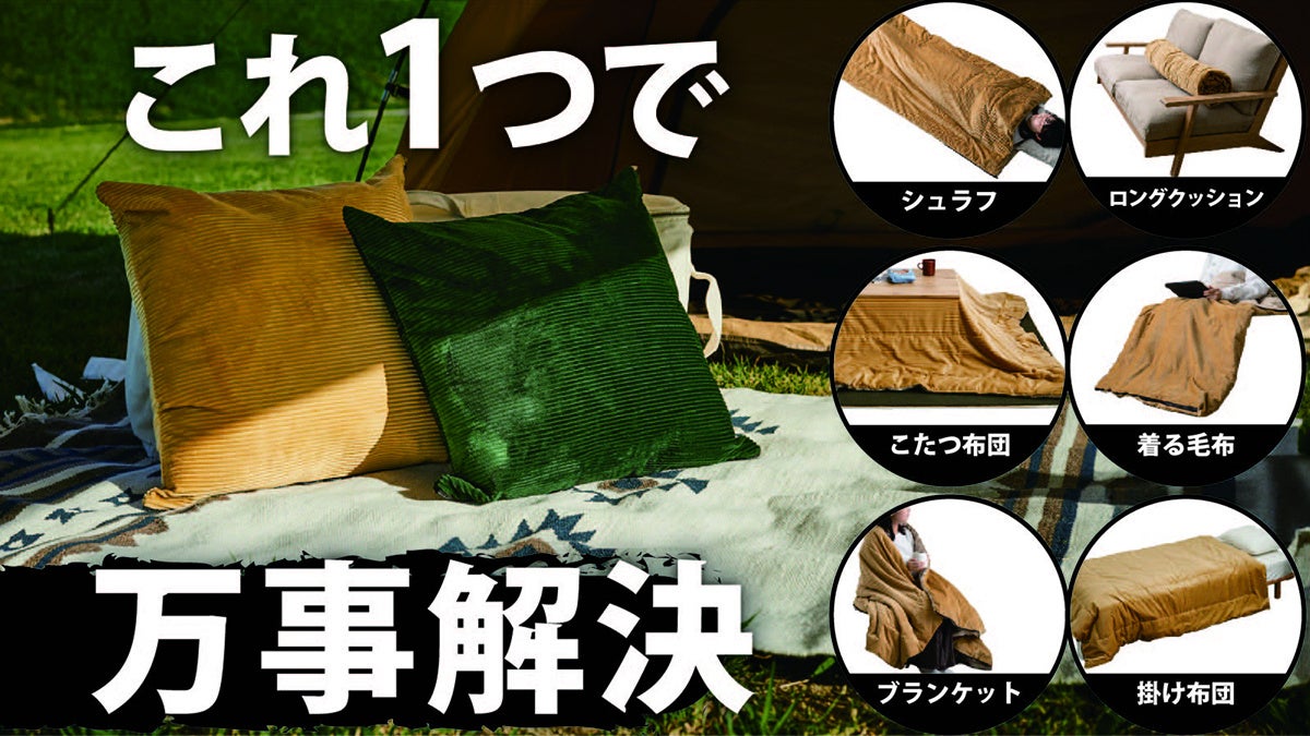 「3wayクッションシュラフ・ラーゴ」は1つでクッション・シュラフ・こたつ布団になり、様々な使い方が出来るマルチクッションです。