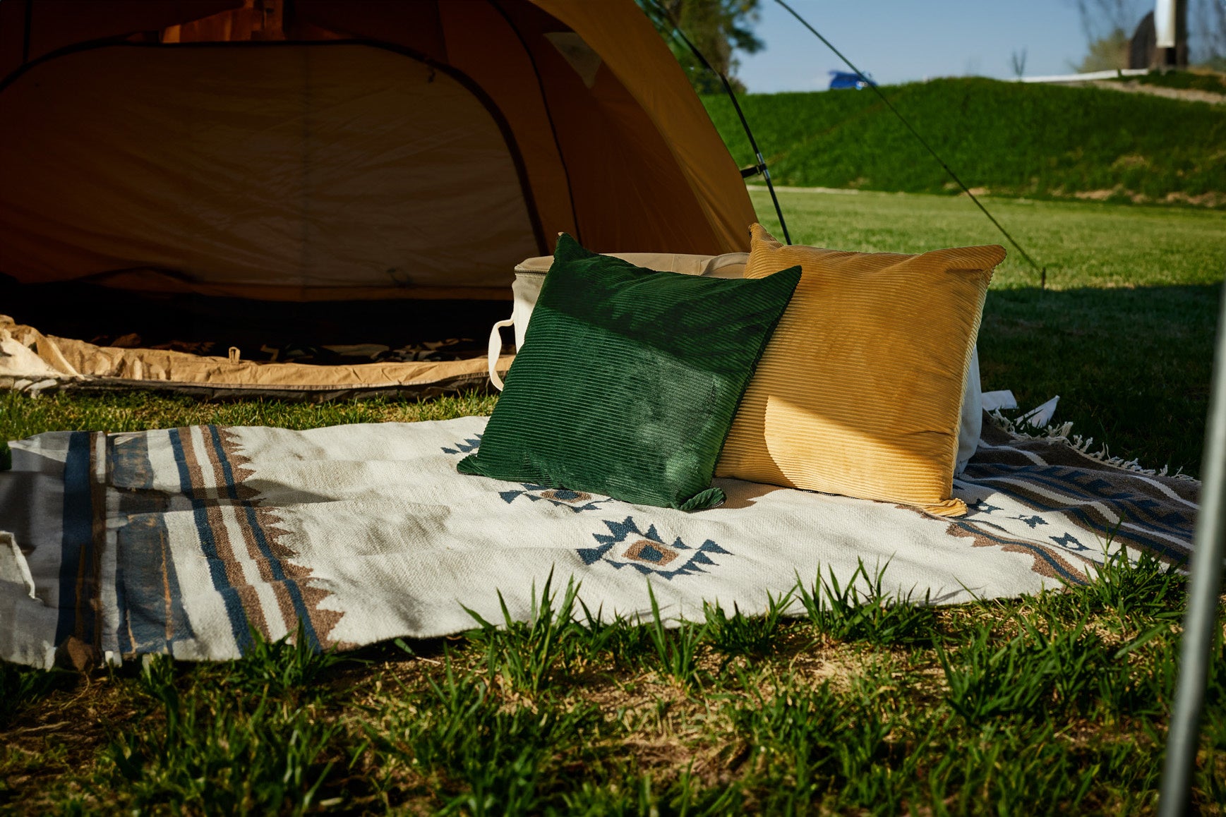 ラグやクッション、ムートンなどの自社製品をキャンプで使う機会が増え、インドアとアウトドアを兼ねたアイテムの魅力に可能性を感じるようになりました。