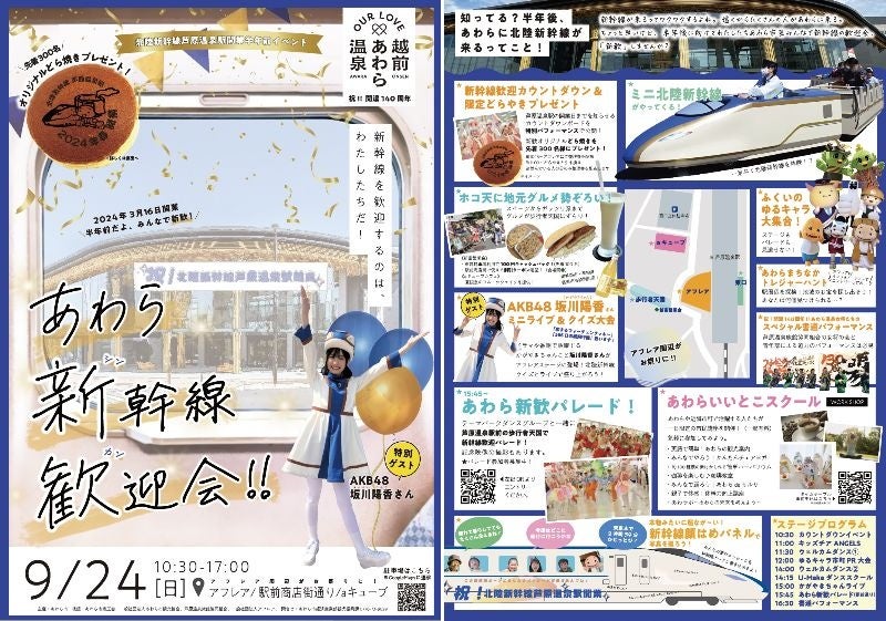 9月24日(日)の開業半年前イベント「あわら新幹線歓迎会」では、AKB48の坂川陽香さんの単独ライブや新幹線ウェルカムダンス披露、福井県内のゆるキャラたちが大集合し、ステージイベントを盛り上げます。芦原温泉旅館協同組合女将の会や青年部による大迫力の書道パフォーマンスも必見です。