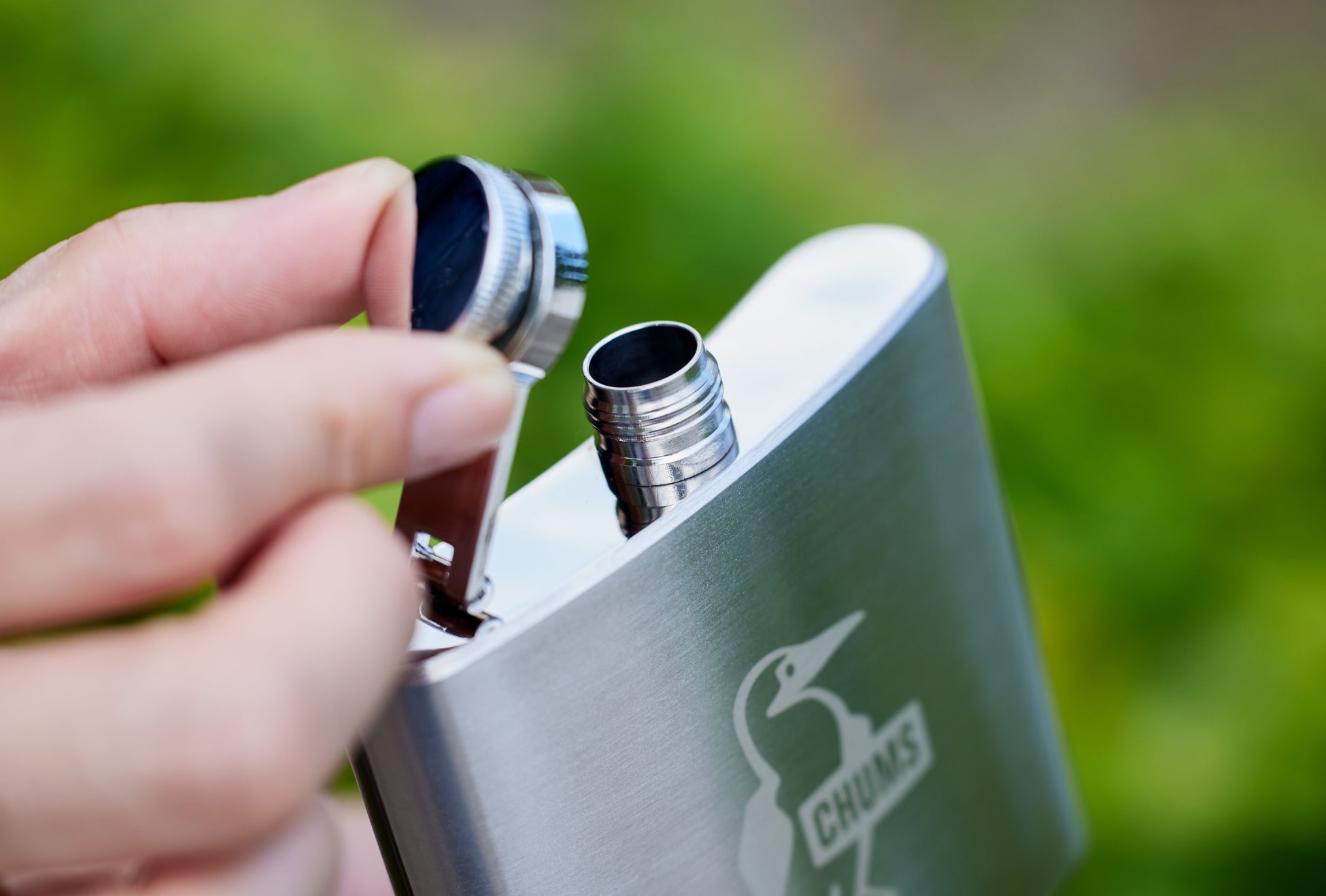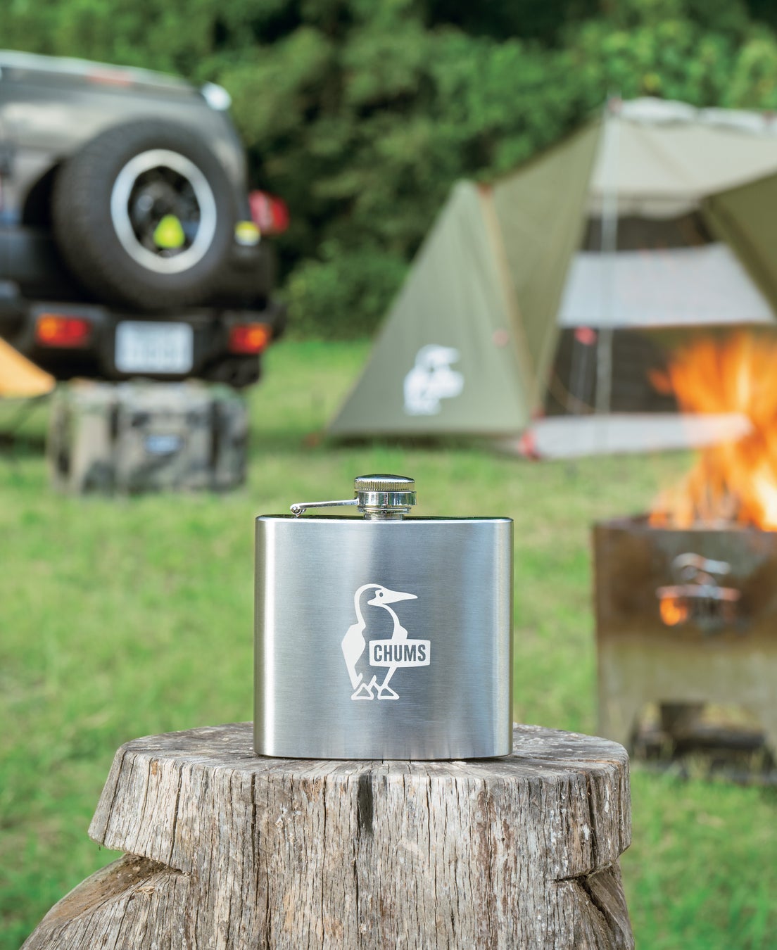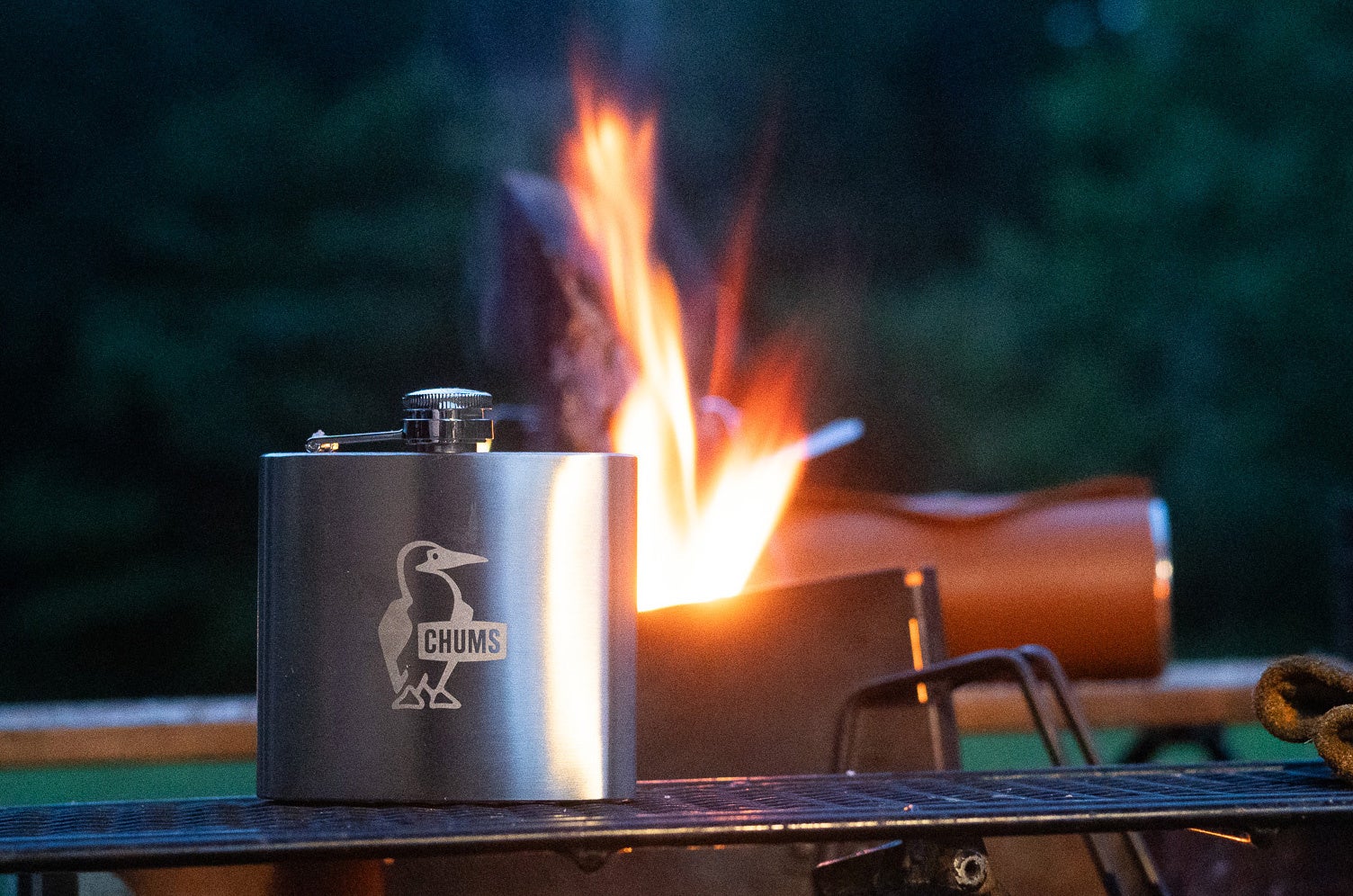 表面に今年40周年を迎えるチャムスのロゴを配しました。お気に入りのウイスキーを入れて、キャンプや旅のお供に!