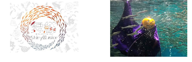 約2万匹のマイワシが、音楽に合わせて大水槽内を縦横無尽に群泳する「舞鰯シャイニーイリュージョン」のハロウィンバージョンでは、エサの入ったカボチャ型のバケツが出現し、マイワシの新たな群泳を生み出します。
