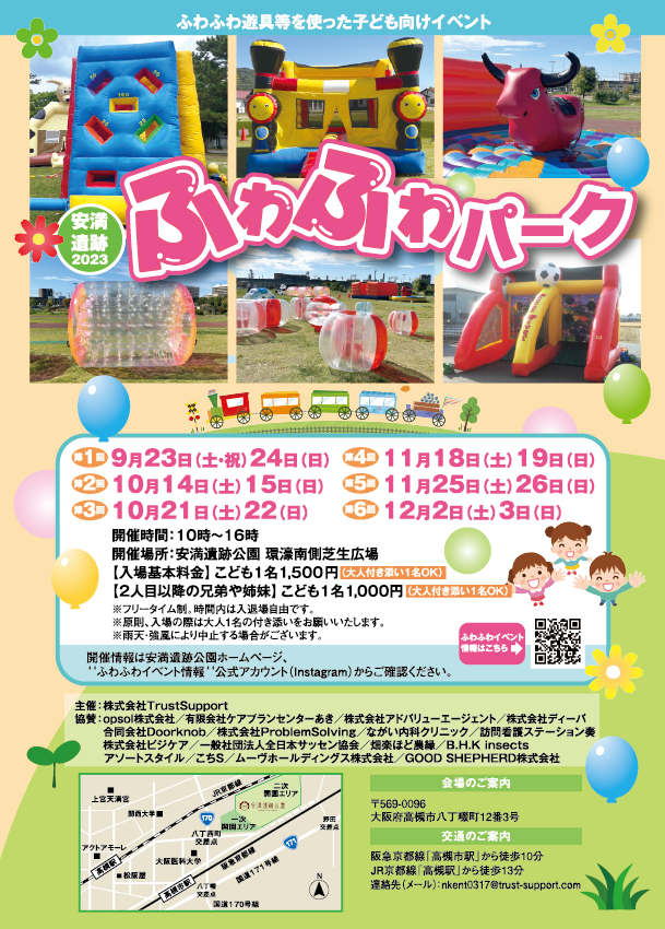 株式会社TrustSupport(大阪市淀川区)が運営する家族で楽しめる子ども向けイベント「ふわふわパーク」を大阪府高槻市の安満遺跡公園にて開催いたします。開催日は9月下旬~12月初旬の予定ですが、詳しい日程はチラシをご確認ください。当イベントは、バブルボール(バブルサッカーで使用する遊具)などのエア遊具やその他ユニークな遊具を数多く取り扱っており、子どもたちにとって安全で楽しい時間になるように運営している子ども向けイベントです。安全面を考慮してスタッフを多めに配置しており、使い方のわかりにくい遊具は常にサポートできるようにしています。