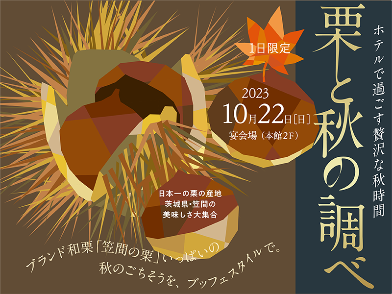 日本一の栗産地、茨城県が誇るブランド和栗「笠間の栗」を贅沢に用いて、王道のモンブランを含むケーキや和菓子などのスイーツをはじめ、ローストポークの揚げ栗添えや栗の冷製カルボナーラなど、栗づくしの料理やスイーツをお楽しみいただける1日限定のイベントです。