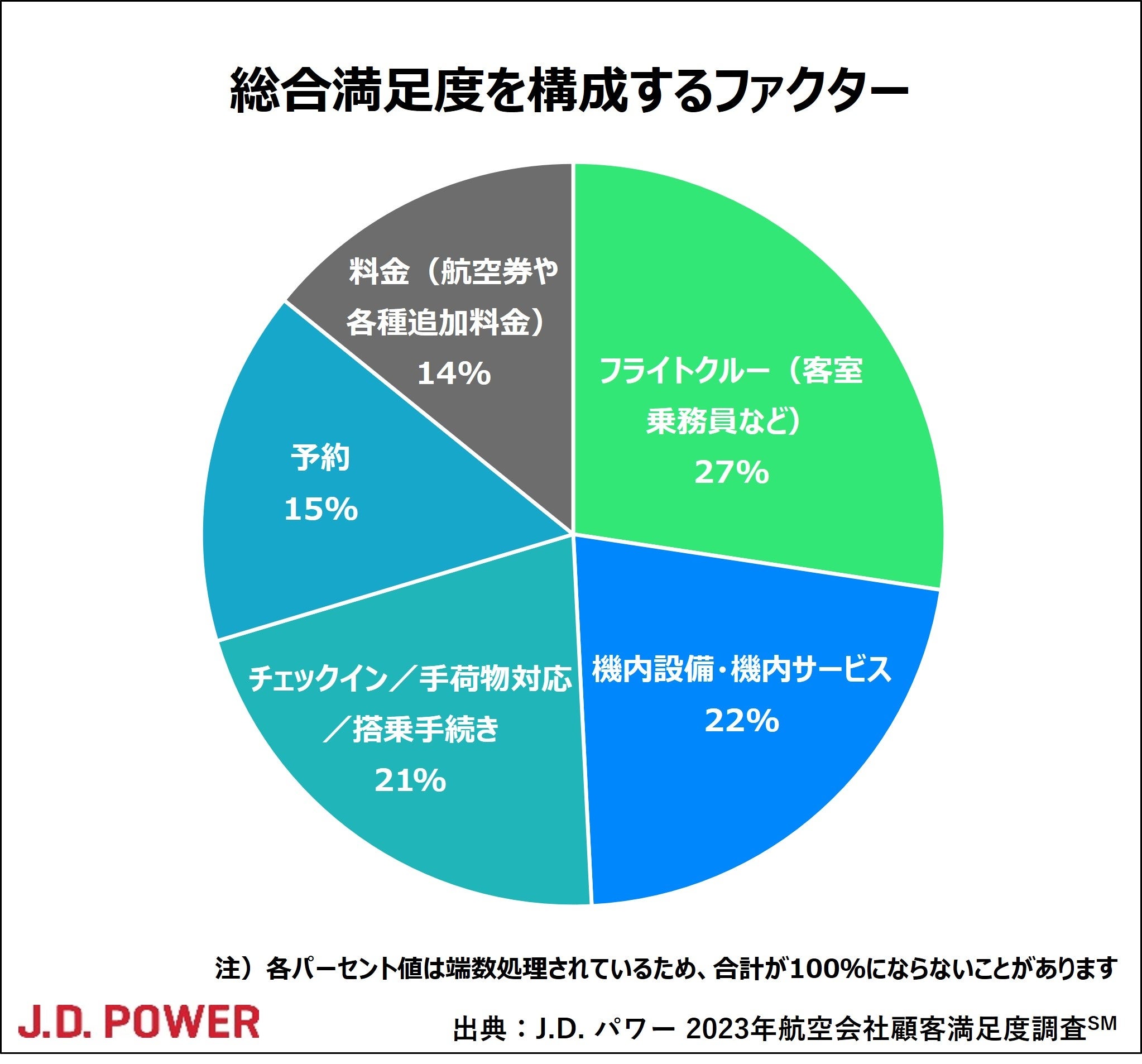 る影響度が大きい順に、「フライトクルー(客室乗務員など)」(27%)、「機内設備・機内サービス」(22%)、「チェックイン/手荷物対応/搭乗手続き」(21%)、「予約」(15%)、「料金(航空券や各種追加料金)」(14%)となっている(カッコ内は影響度)。
