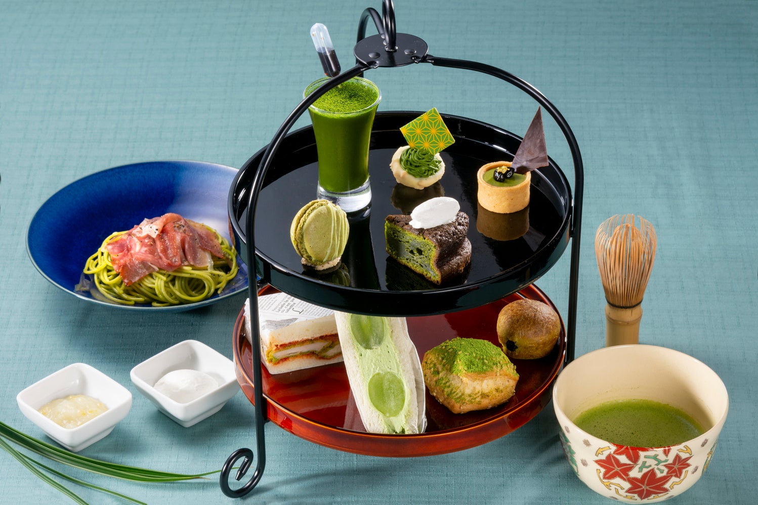 上段には枯山水を連想させるような渦巻き模様が特徴の抹茶のタルトや、抹茶モンブランなどのスイーツが並びます。下段には大納言入り抹茶のブリオッシュをはじめとした4種類のセイボリーをご用意いたしました。また、別皿のスペインの生ハム‘ハモンセラーノ’と抹茶のクリームパスタはほろ苦く濃厚な抹茶クリームと旨味が凝縮された生ハムとの相性を楽しむことができる一品となっております。