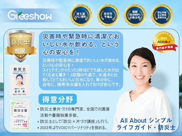 Greeshowの携帯浄水器は、災害や断水などの緊急時、地震、津波、台風、豪雨などの自然災害が発生した時、川やため池の水、お風呂の残り水などを安心して飲めるほど透き通った清潔な飲料水にろ過することができます。大切な家族の為の災害時の備え! 緊急用に一つ常備しておくことをおすすめします。