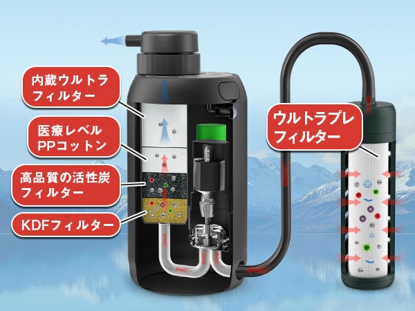 フィルターは、取り外し可能な設計となっており、古いフィルターを簡単に交換することができます。Greeshowの浄水器は、大容量バッテリーを搭載し、連続で1000L以上の水を濾過できます。独自の「5段階浄水システム」の仕組みをご紹介致します。