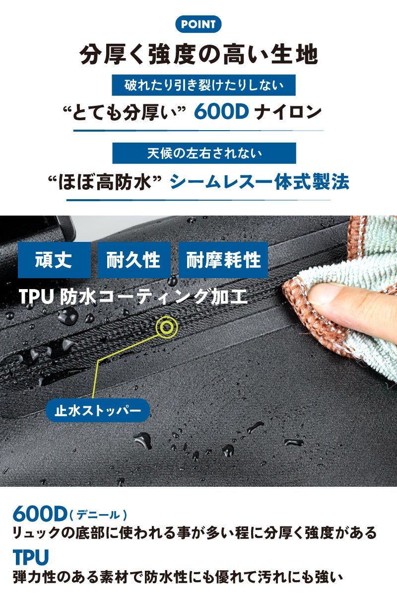 表面に防水TPUコーティングとジッパーには防水性ファスナーを採用し防水性をさらに強化しました。