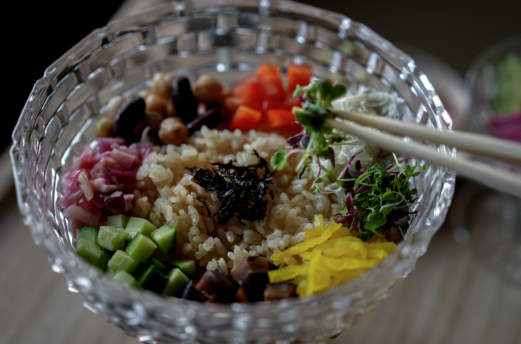 ・ネタ8種:おぼろ昆布/きゅうり/パプリカ/ミックスビーンズ/マイクログリーンミックス/椎茸の含め煮/茗荷のピクルス/たくあん