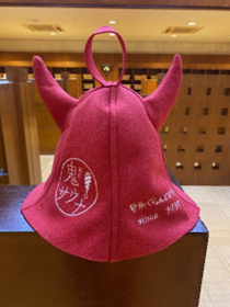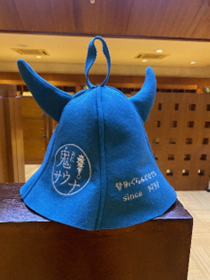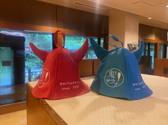 登別温泉の観光地「地獄谷」からインスピレーションを得て、赤鬼・青鬼をイメージしたツノのついたサウナハットに「登別グランドホテル85周年記念ロゴ」と「鬼サウナロゴ」をあしらった登別グランドホテルオリジナル商品です。
