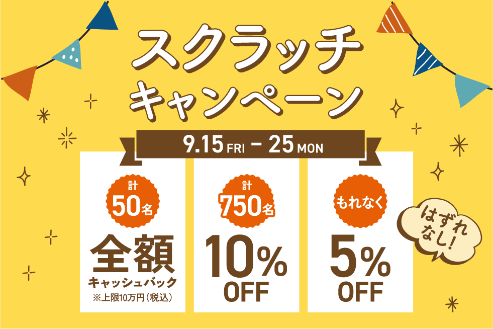 期間中キャンプ用品・トレッキング用品・アウトドアウェアを合計5,000円(税込)以上ご購入のお客様を対象に、レジにてデジタルスクラッチを引いていただくと、50名様に「全額キャッシュバック(上限10万円)」、750名様に「10%OFF」、そのほか全員にもれなく「5%OFF」がその場で当たります。