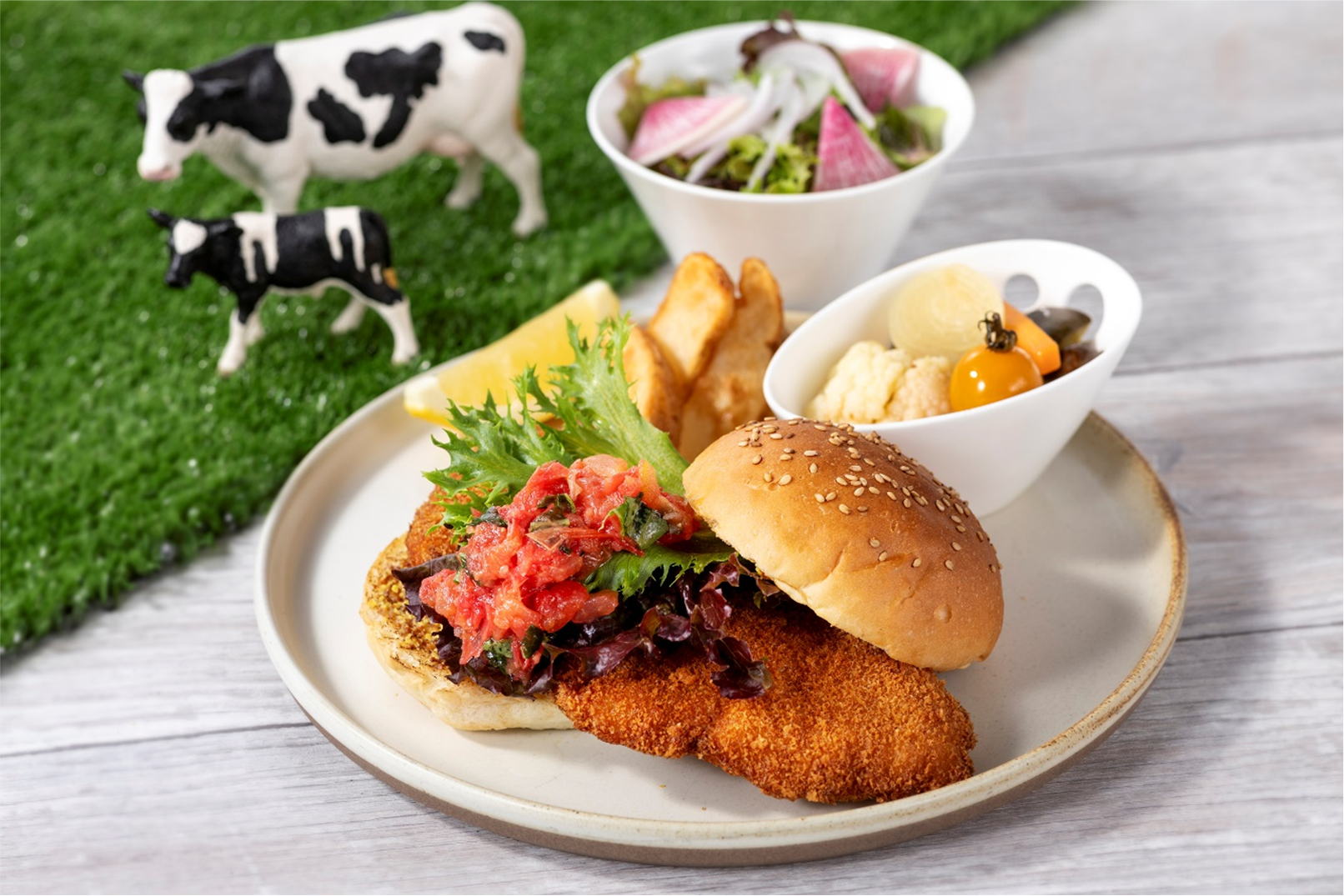 〈新鮮野菜とチーズビュッフェ付!〉那須野ヶ原牛のBIGシュニッツェルサンド … ドリンク付 2,000円(税込)/※テイクアウト(お野菜たっぷりサラダ付き)… ¥1,800(税込)
