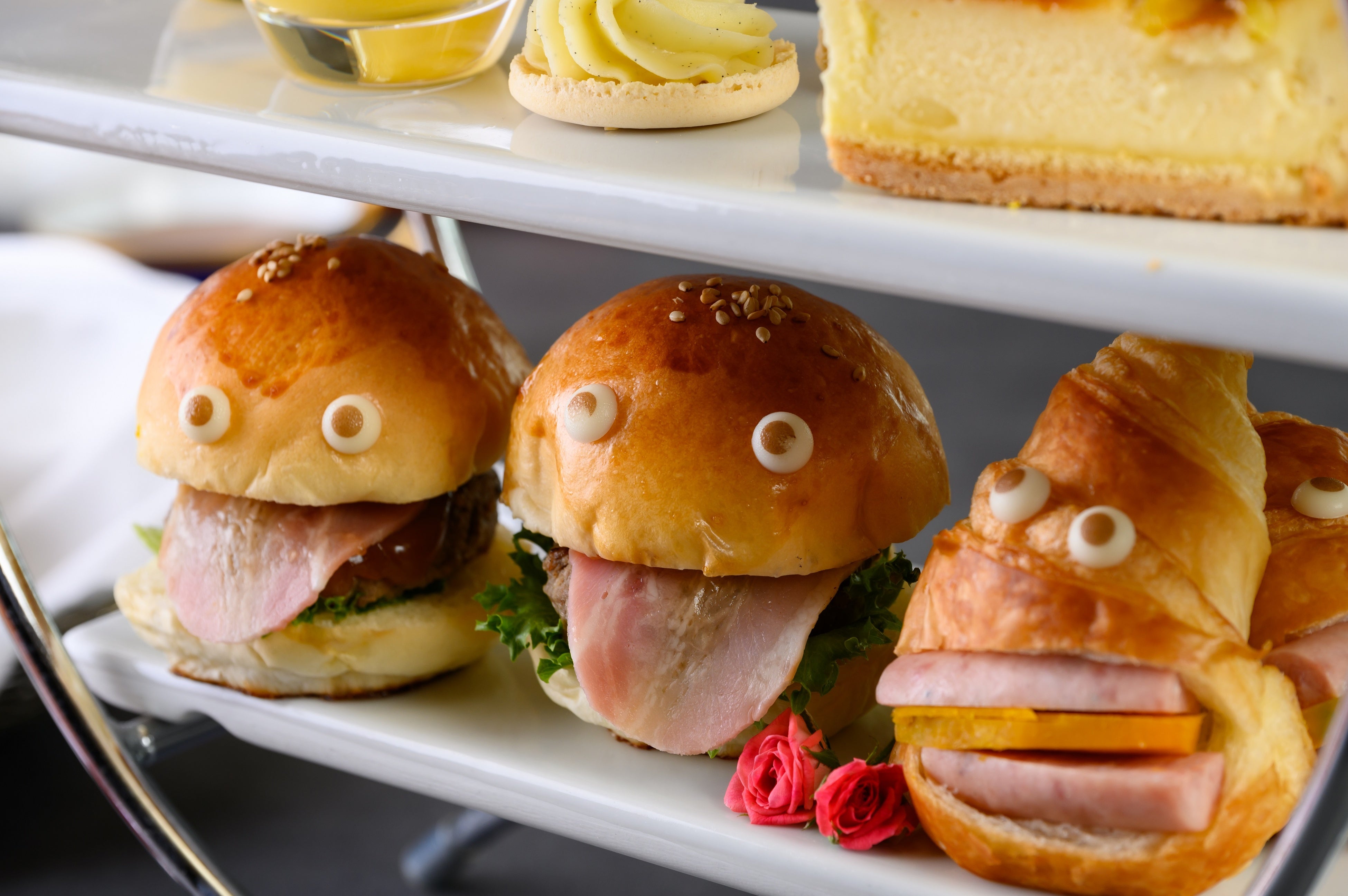 下段のセイボリーでは、ベロを出したかわいいオバケをイメージさせたバーガーやクロワッサンサンドが、顔をのぞかせて、ハロウィンを演出しています。